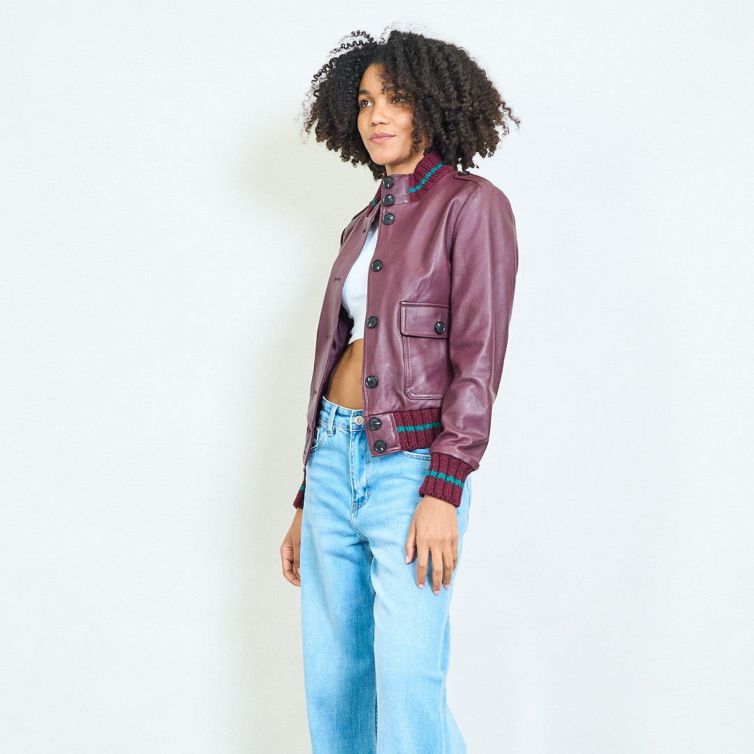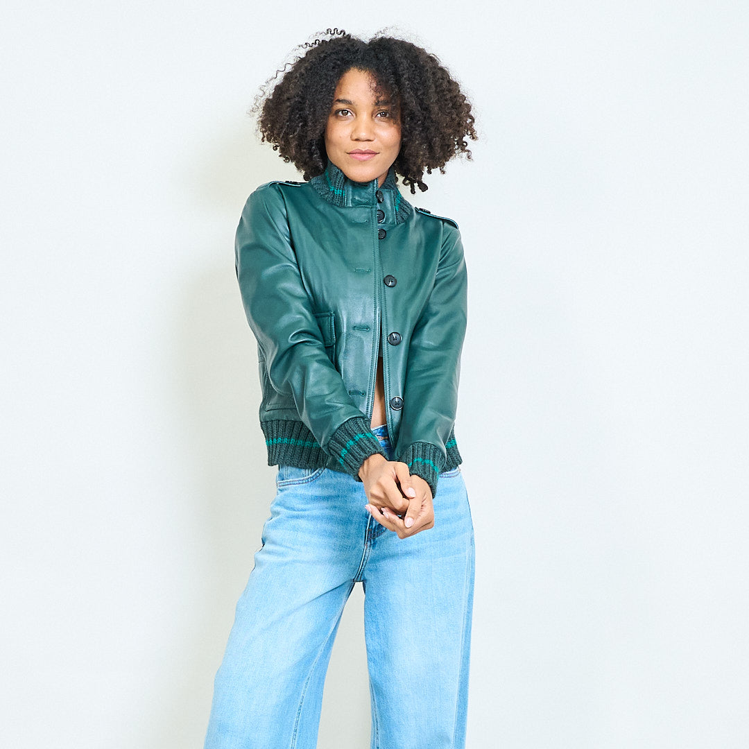 Jaqueta utilitária de couro genuíno com colarinho de malha e detalhe de botão por atacado