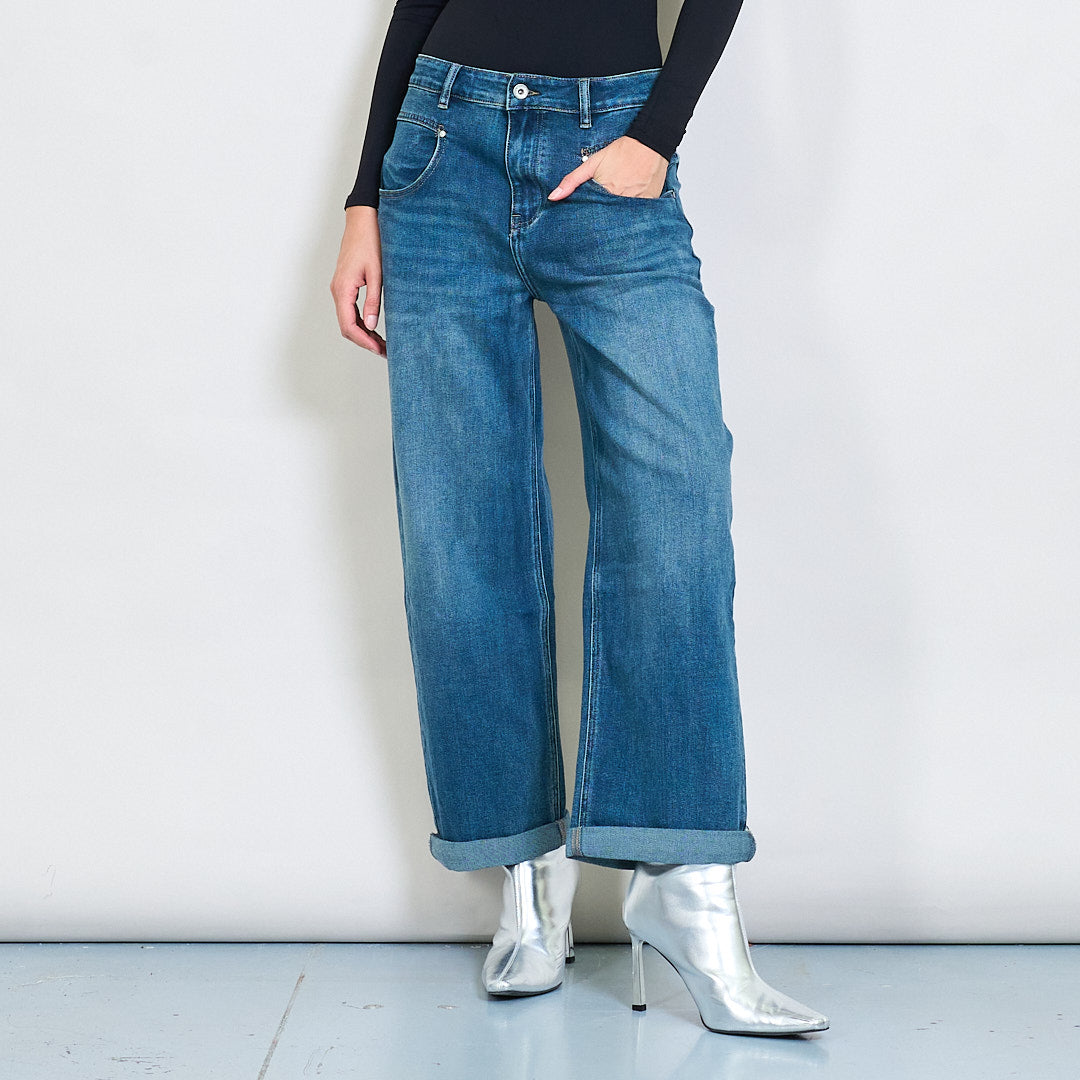 • Jeans azul de lavagem no meio com desbotamento sutil para um toque vintage