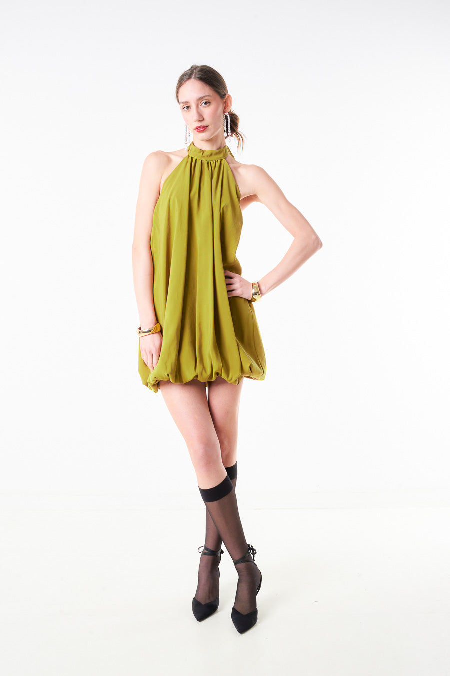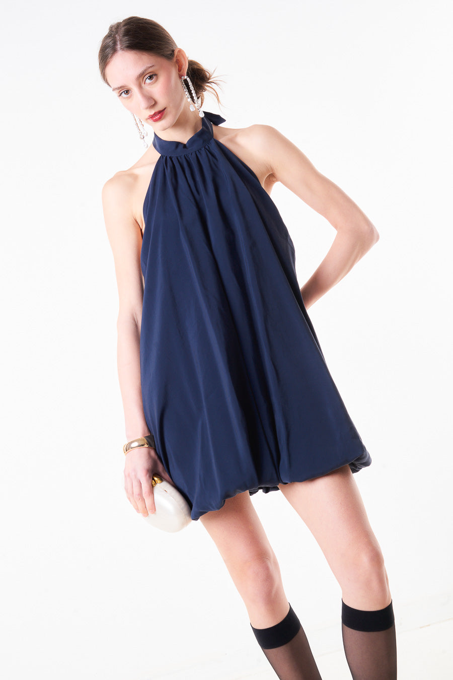 Mini vestido plissado com decote halter e decote franzido e bainha balão no atacado