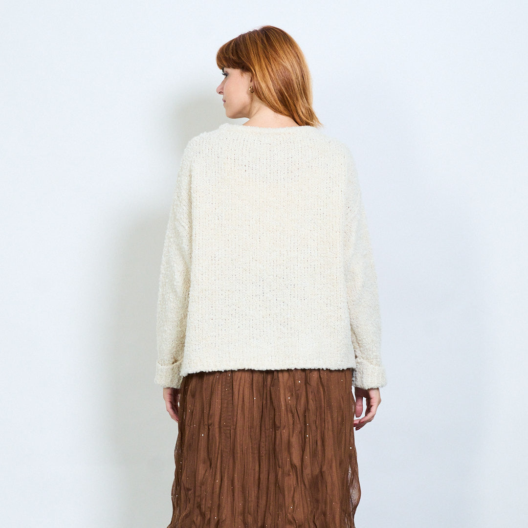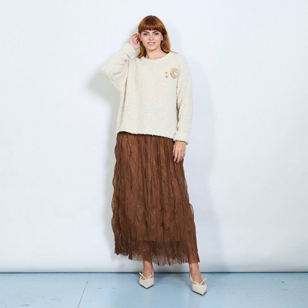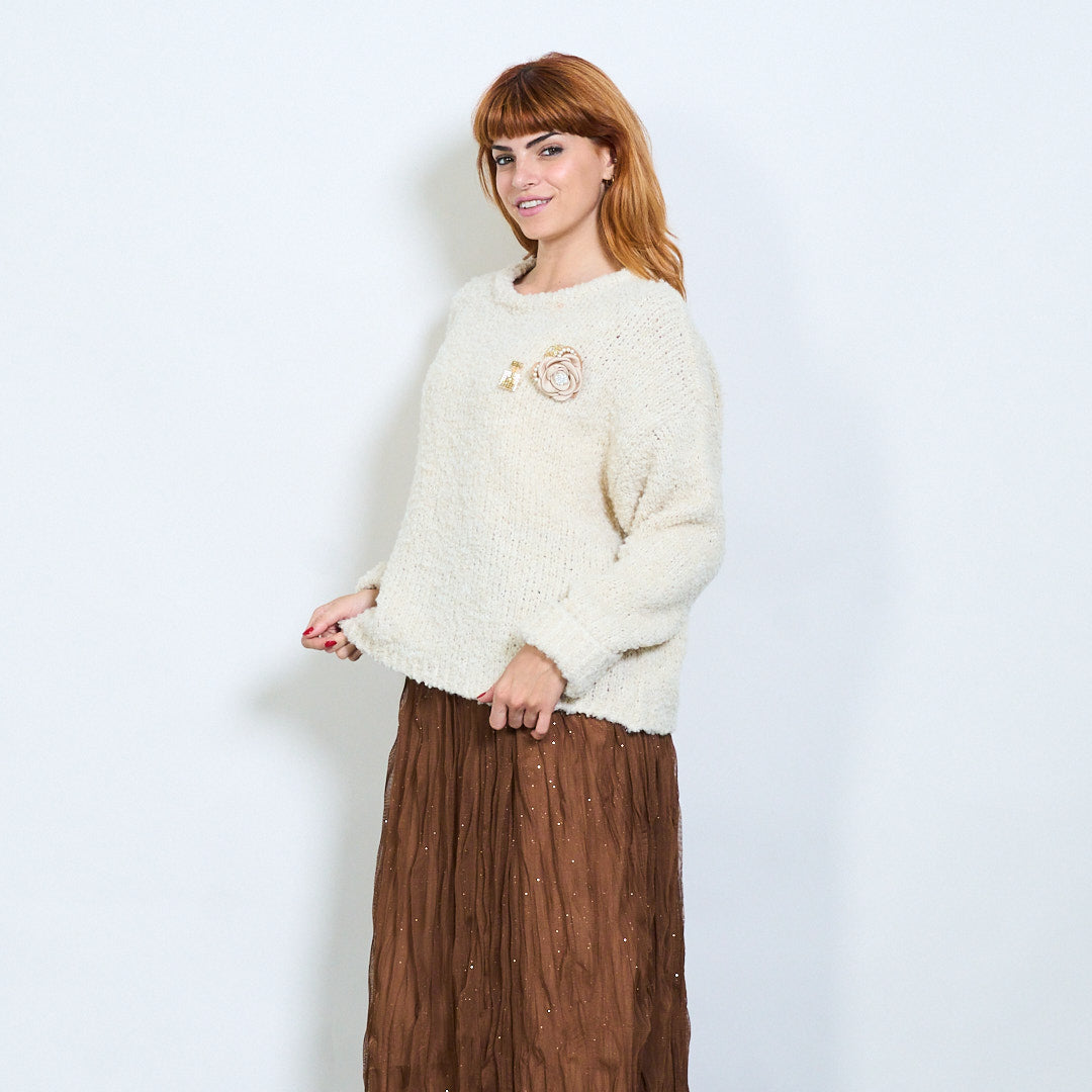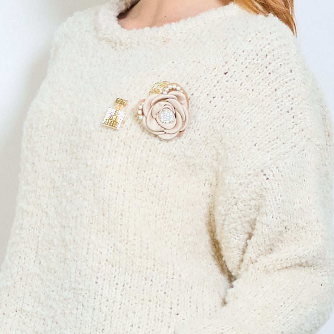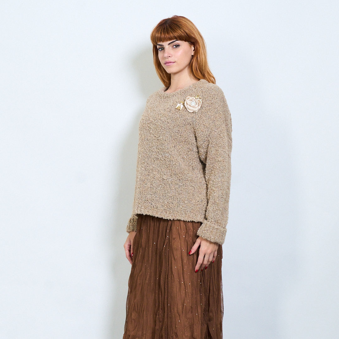 Camisola de malha texturizada com broche floral e detalhe de charme por atacado