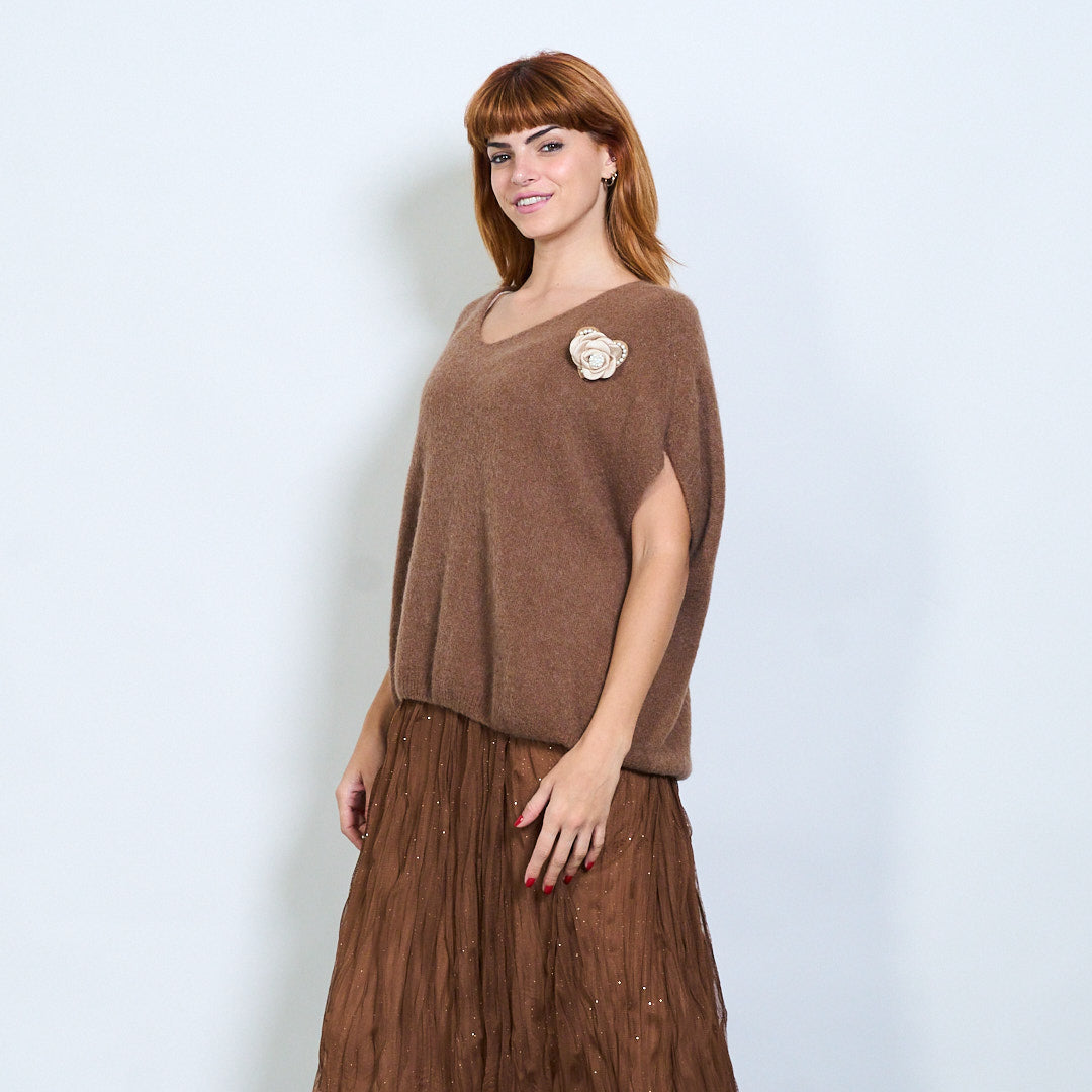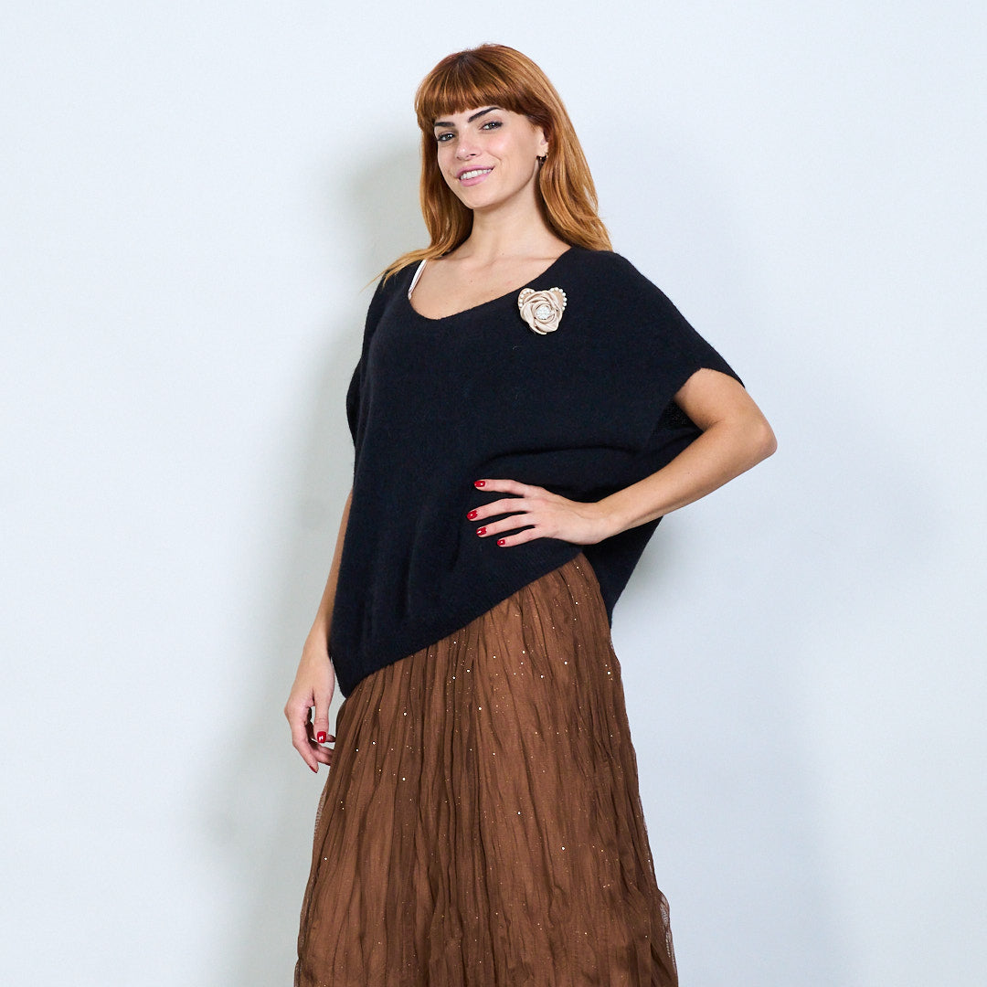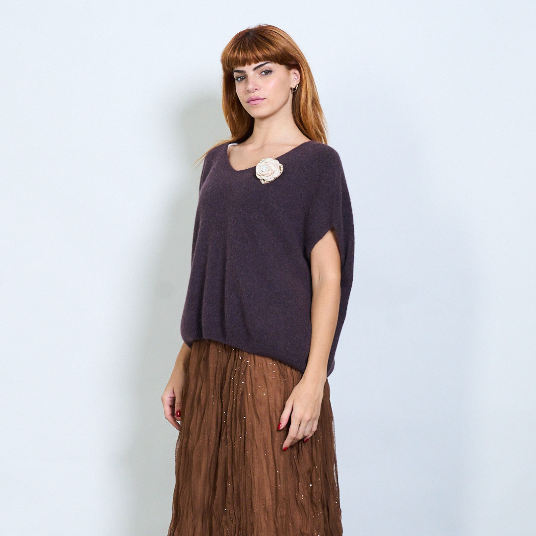 Top de malha de manga curta com detalhe de broche de flores no atacado