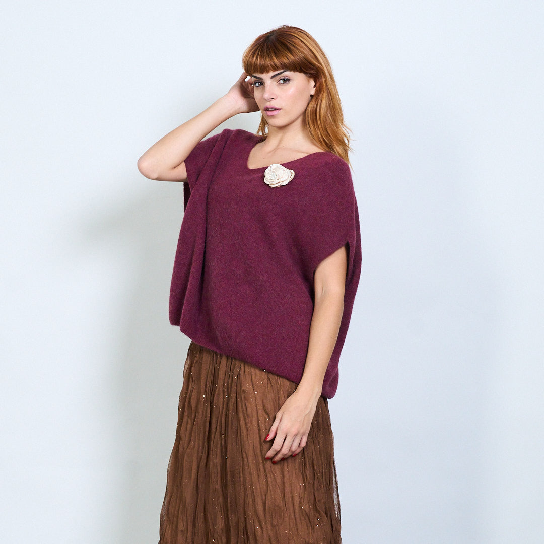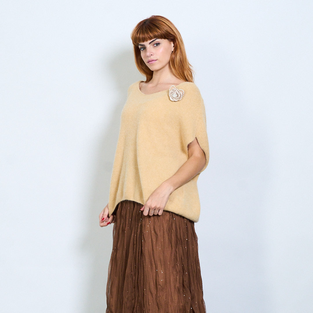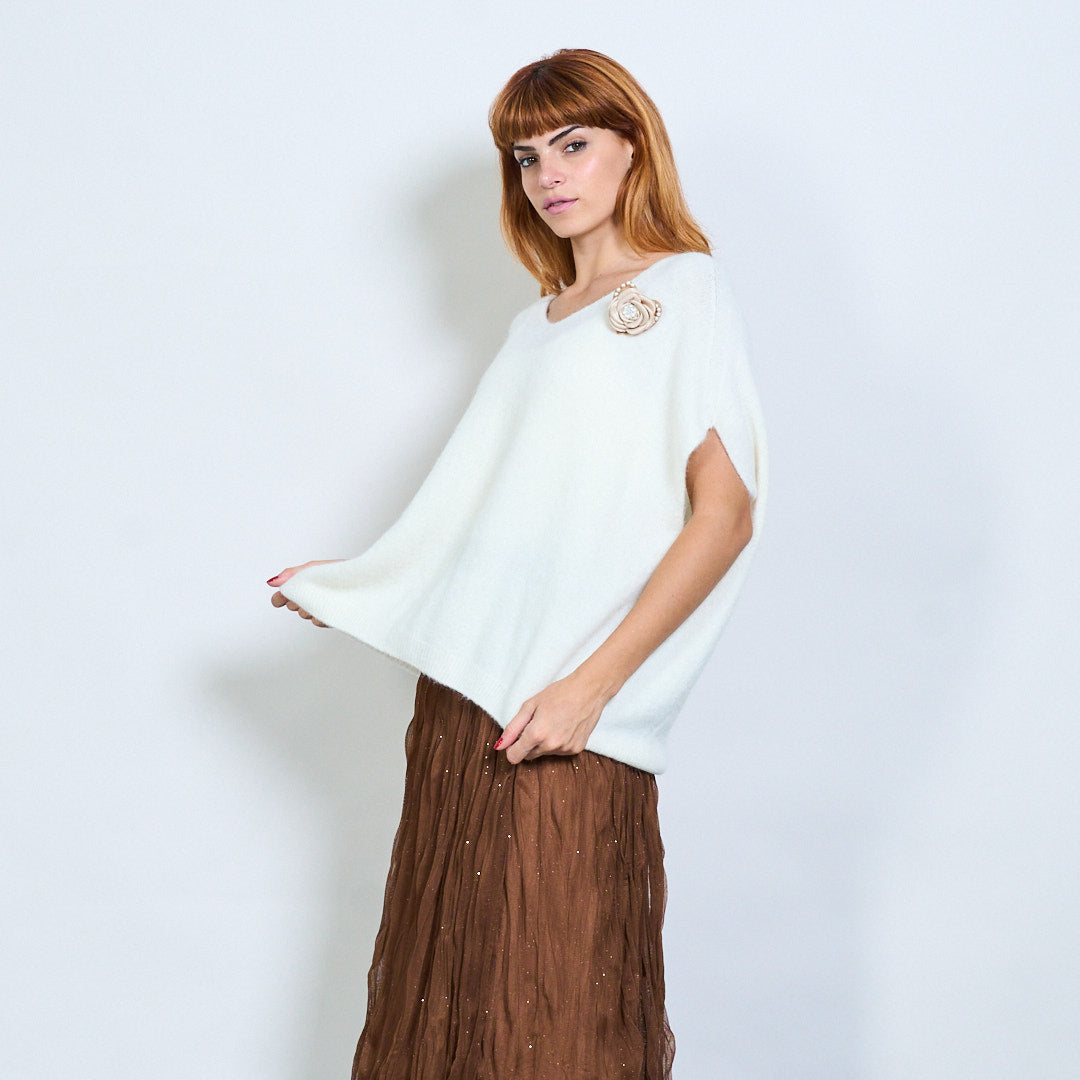 Top de malha de manga curta com detalhe de broche de flores no atacado