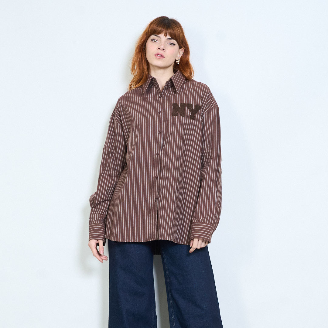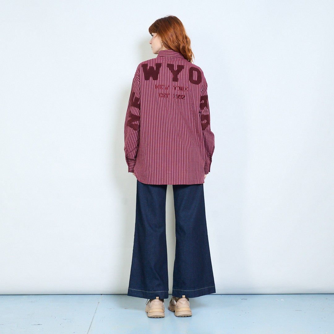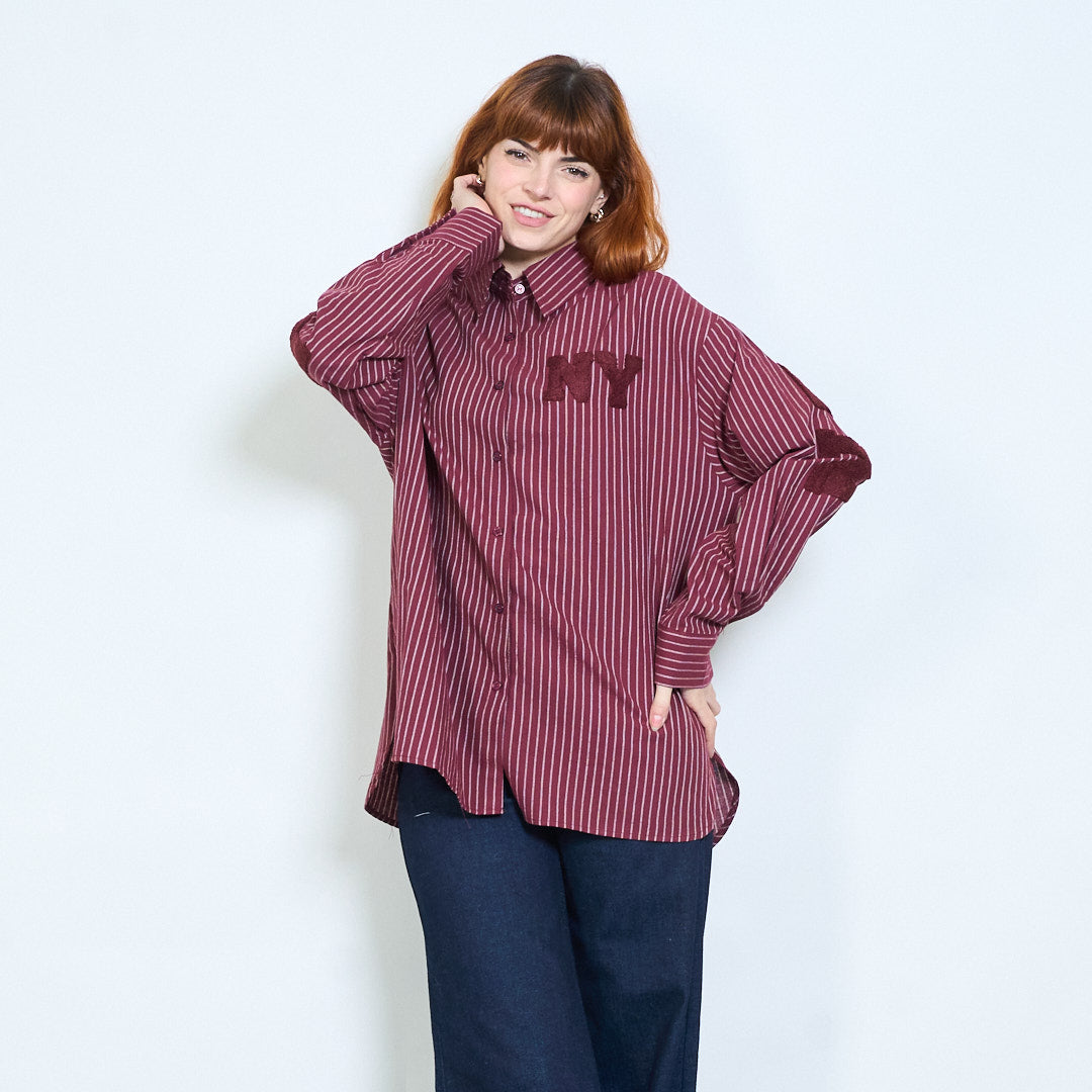 Camisa listrada com botões texturizados “NY” e “WYO” do time do colégio no atacado