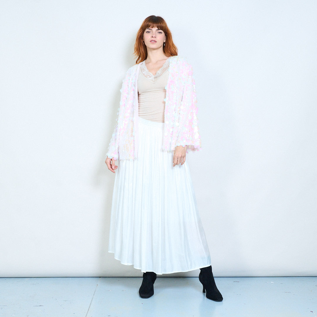 - Totalmente coberto por grandes discos de lantejoulas brilhantes para um visual dramático