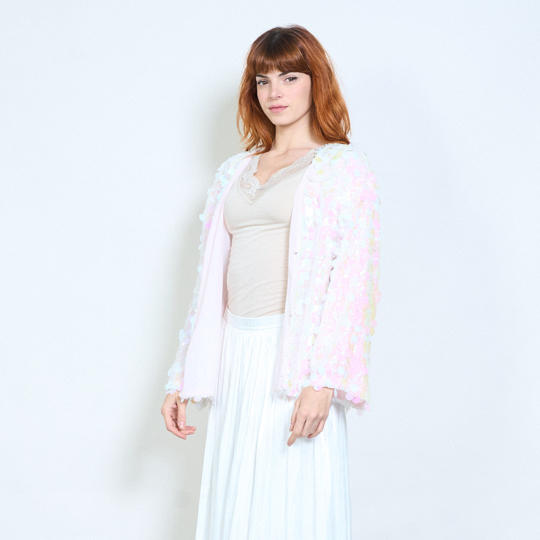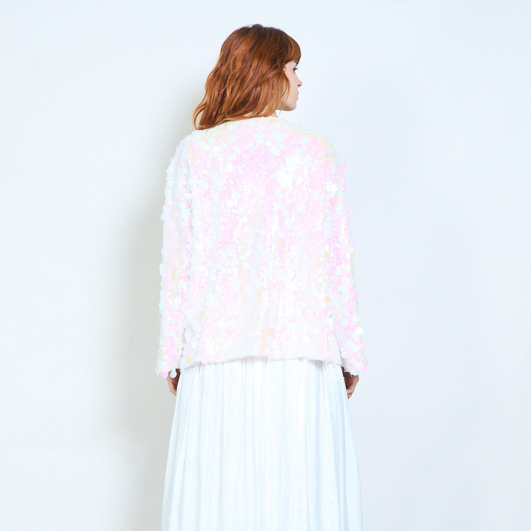 - A paleta de lantejoulas multitons cria um efeito visual sonhador e iridescente