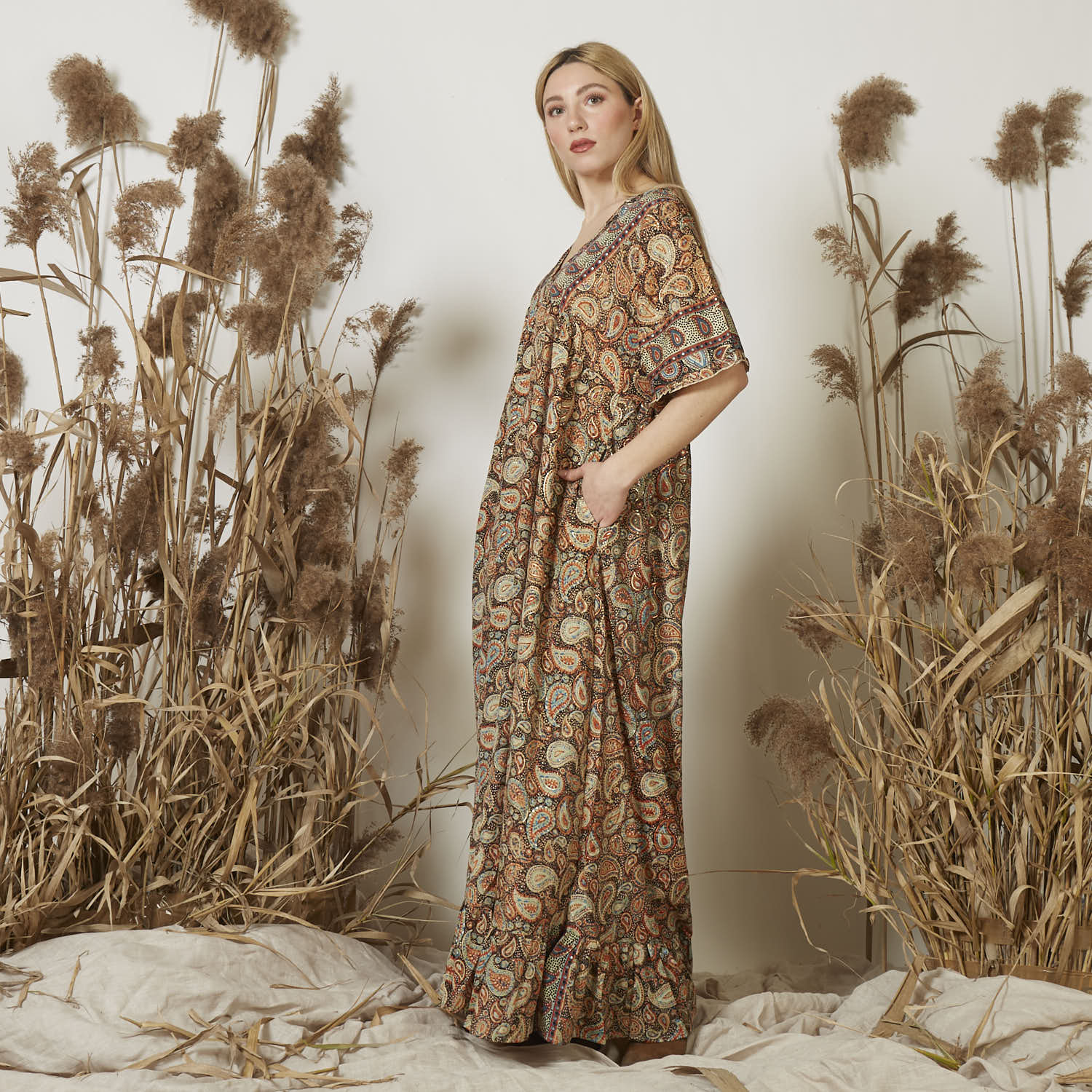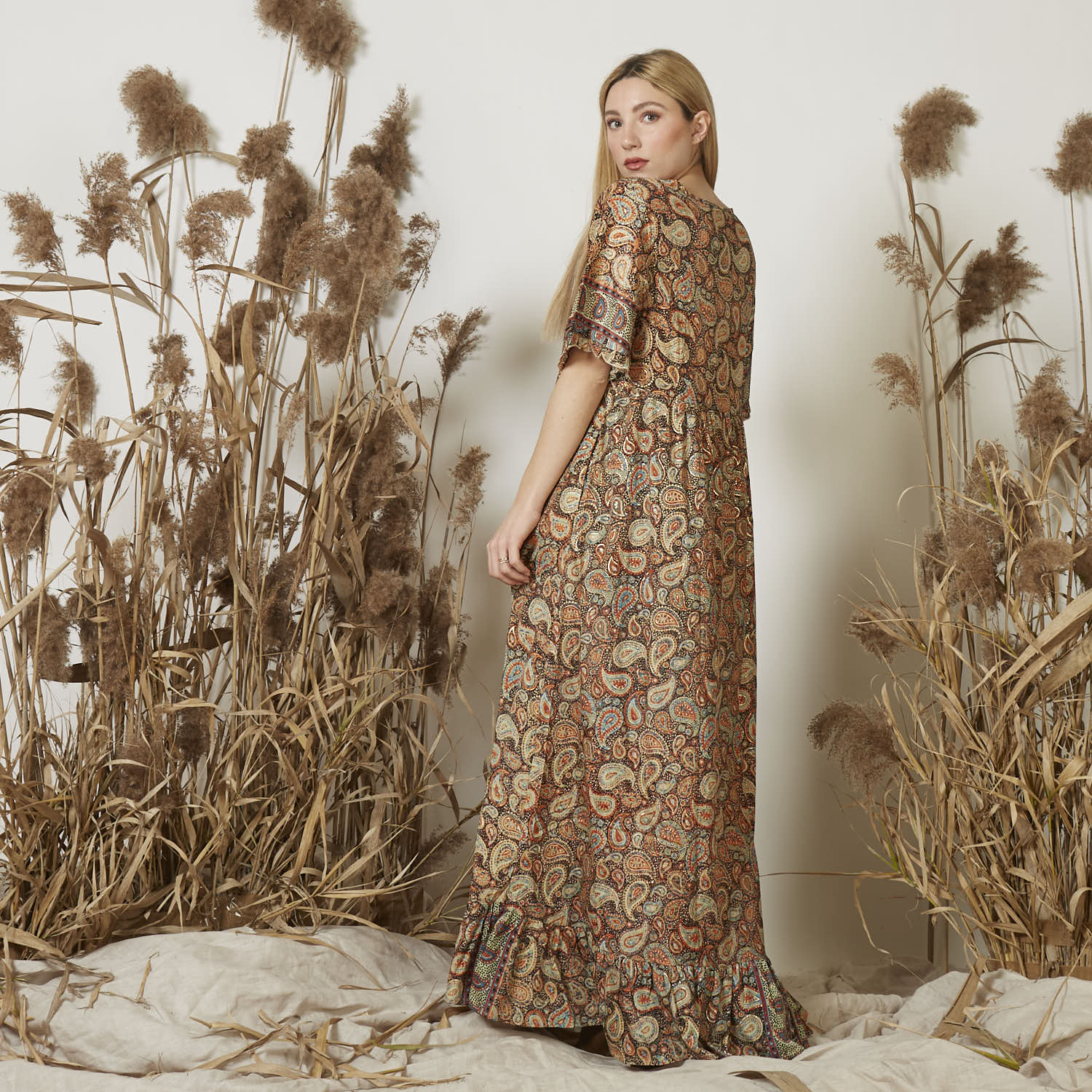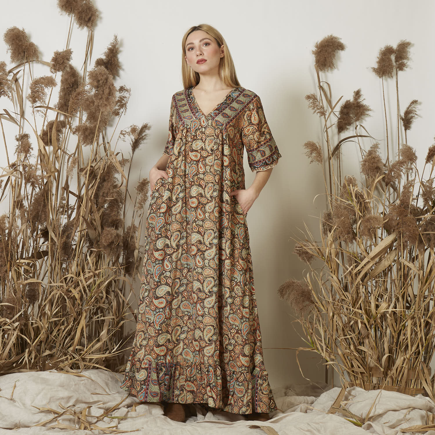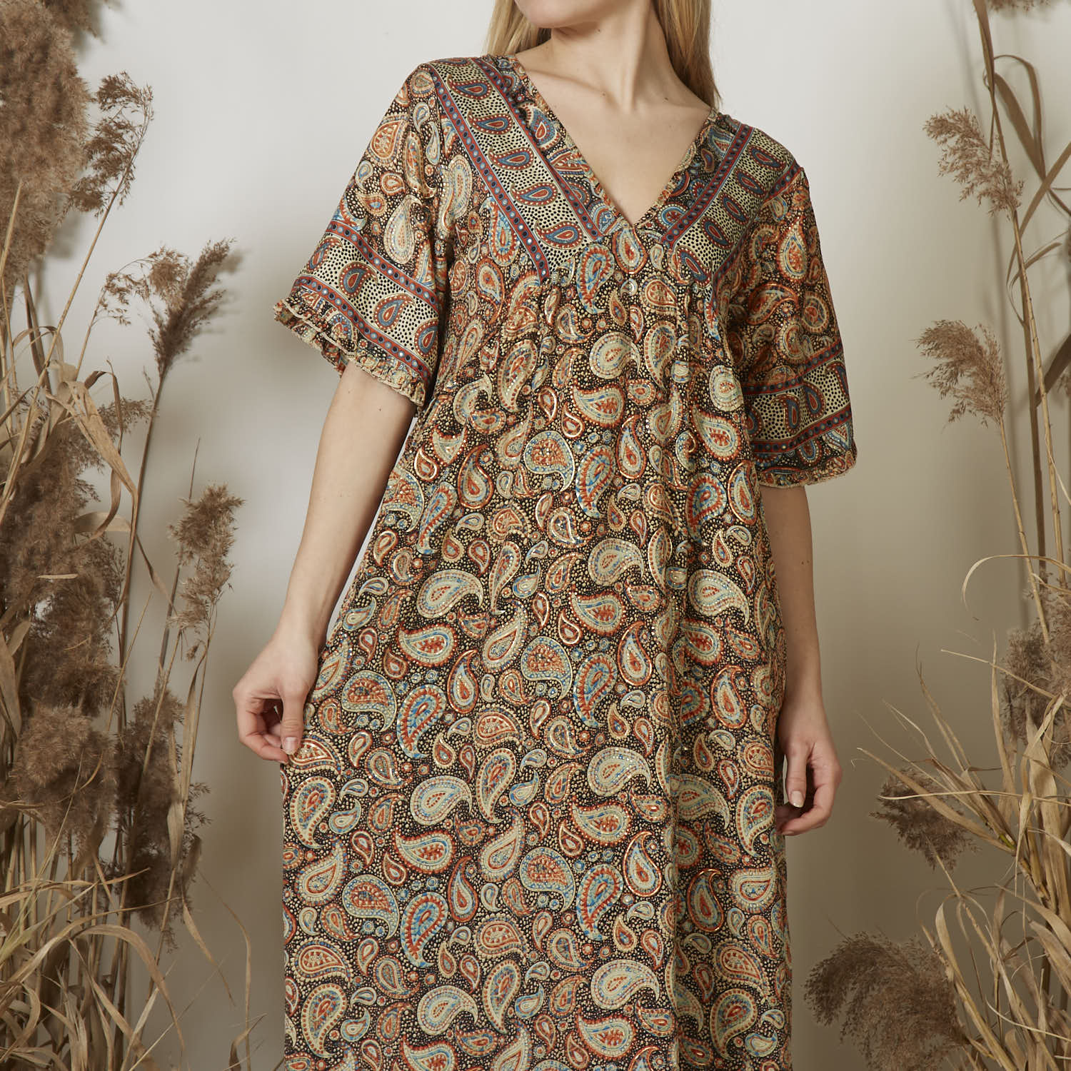 Vestido de seda de pescoço em V grande porte com bainha com babados