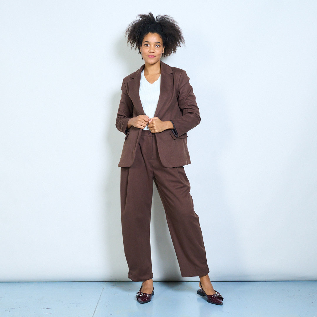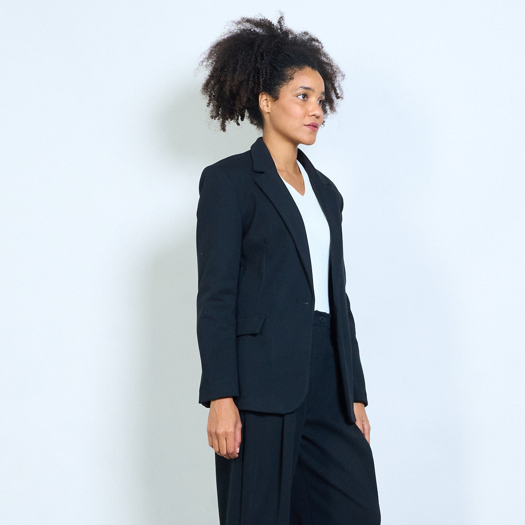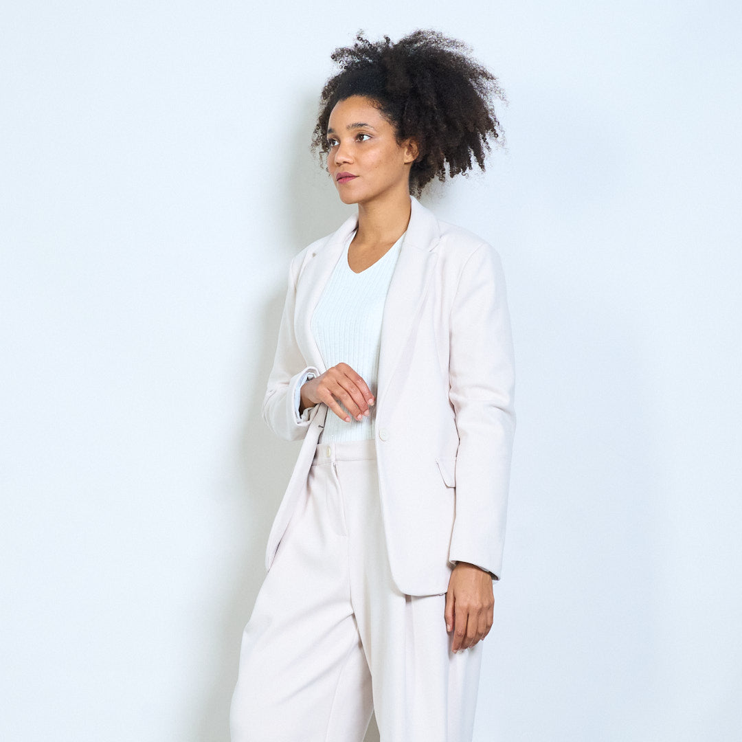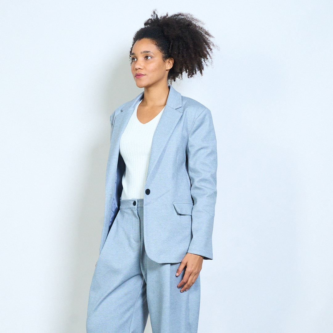 - O fecho de botão trespassado adiciona estrutura e sofisticação