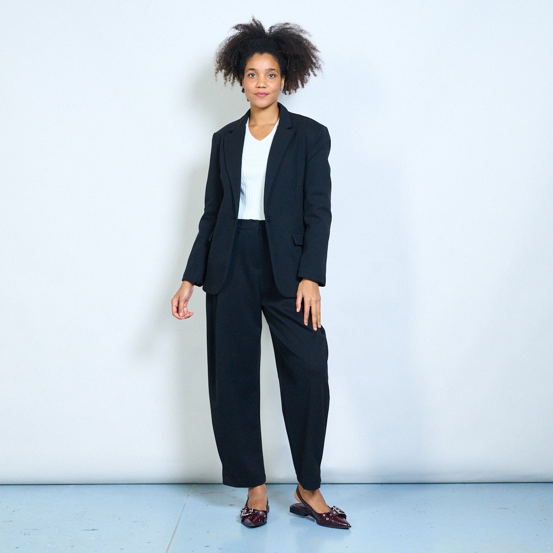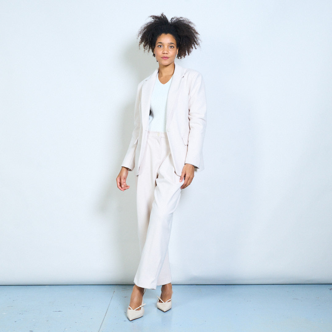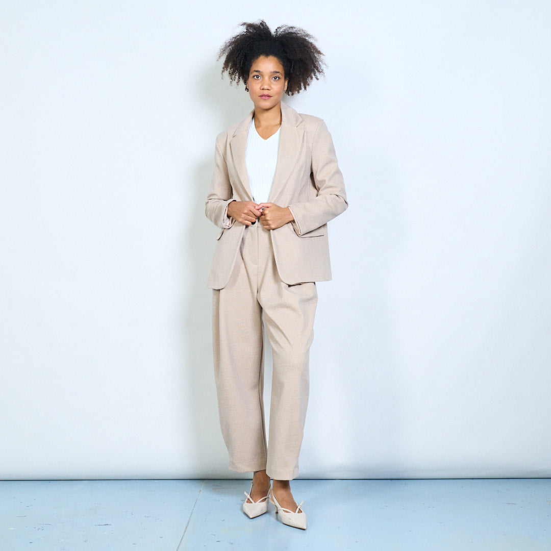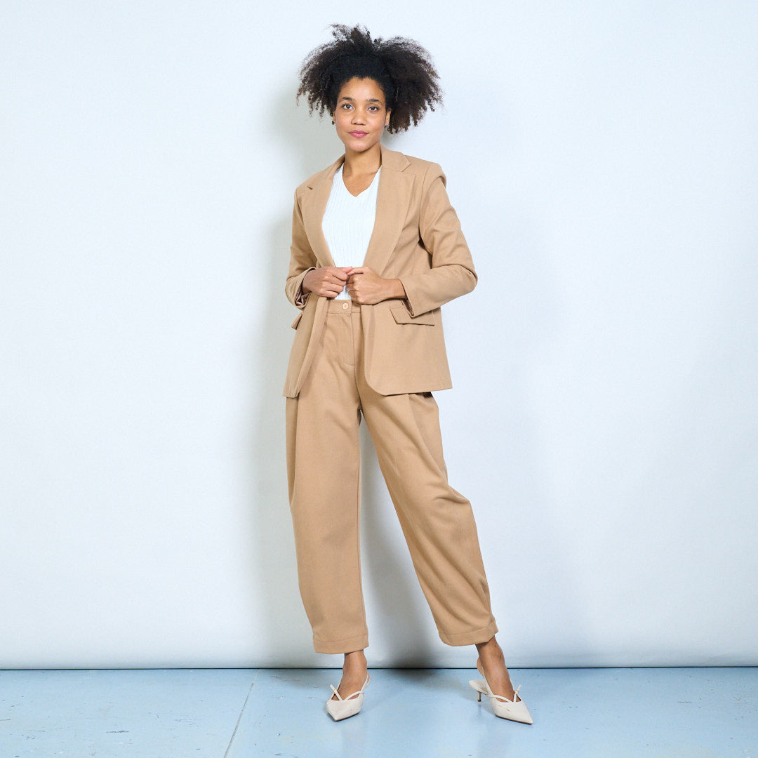 - O fecho de botão trespassado adiciona estrutura e sofisticação