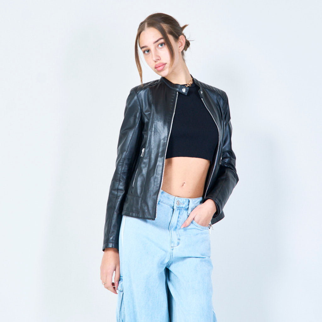 - Jaqueta de couro aerodinâmica com detalhes de ombro acolchoados