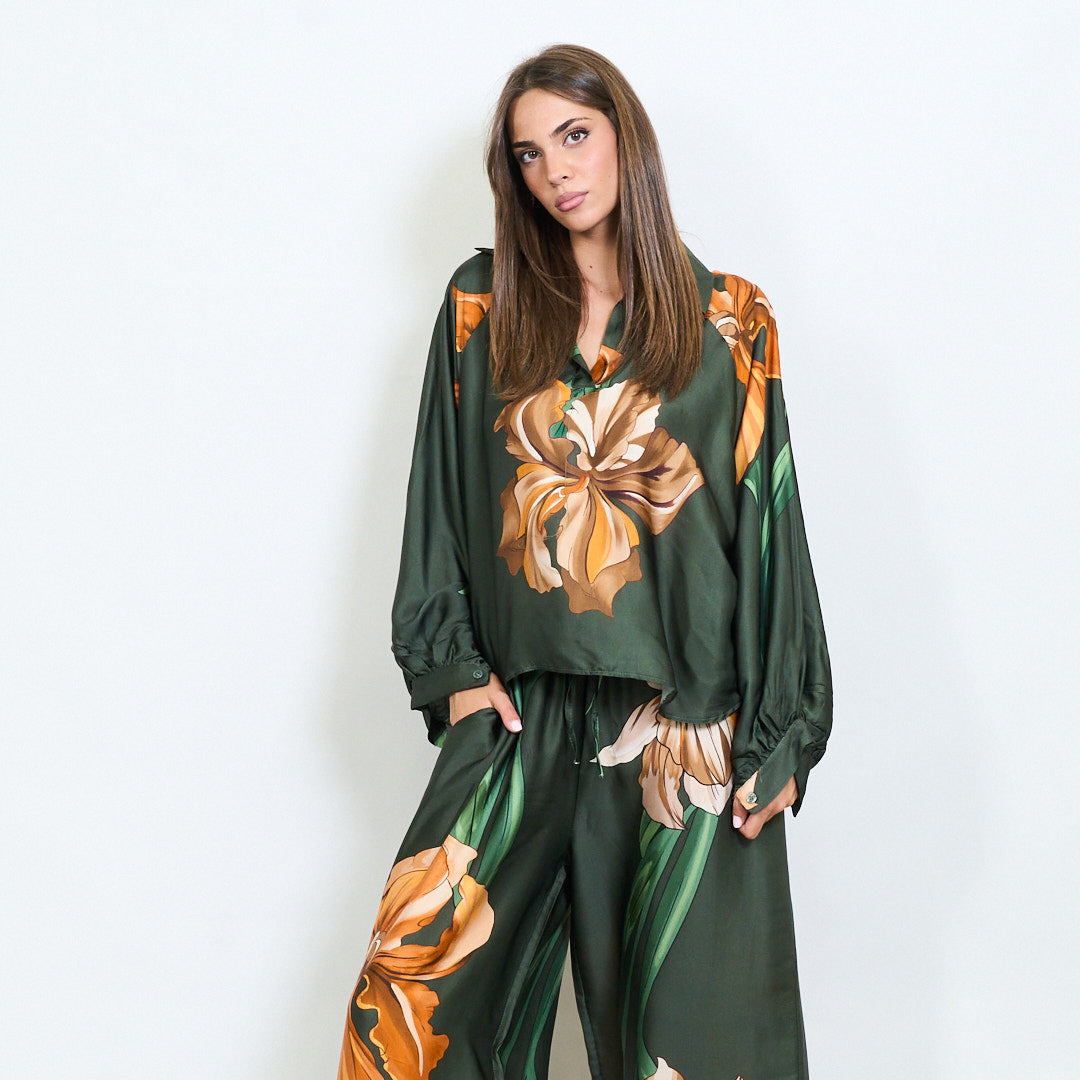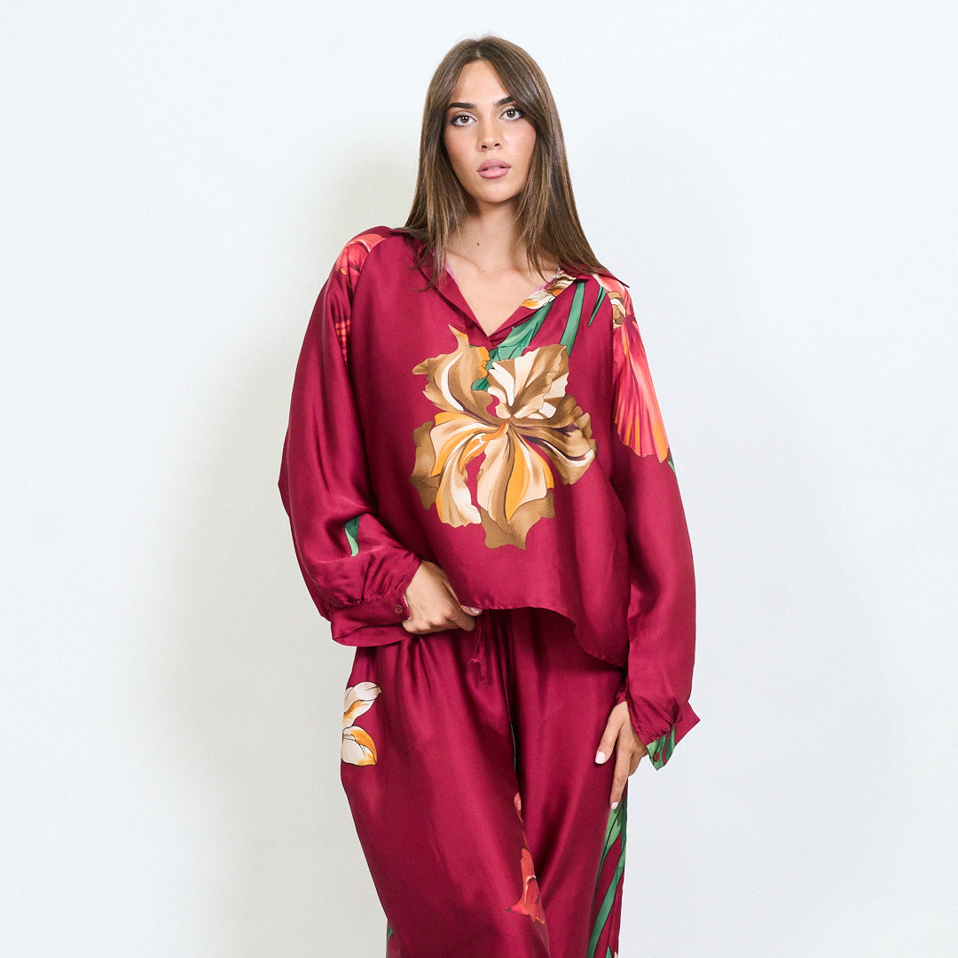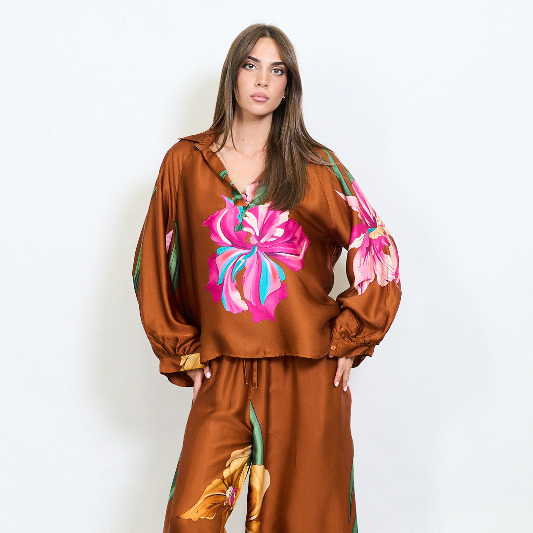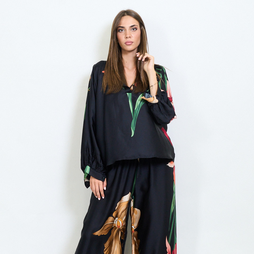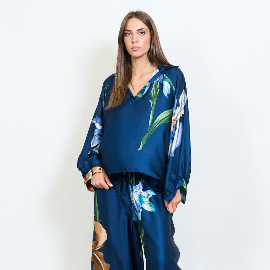 Blusa de colarinho floral de grandes dimensões
