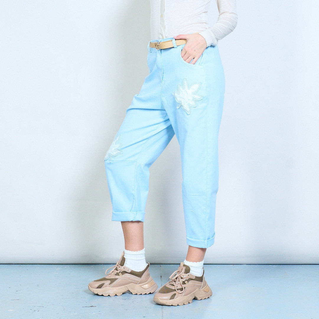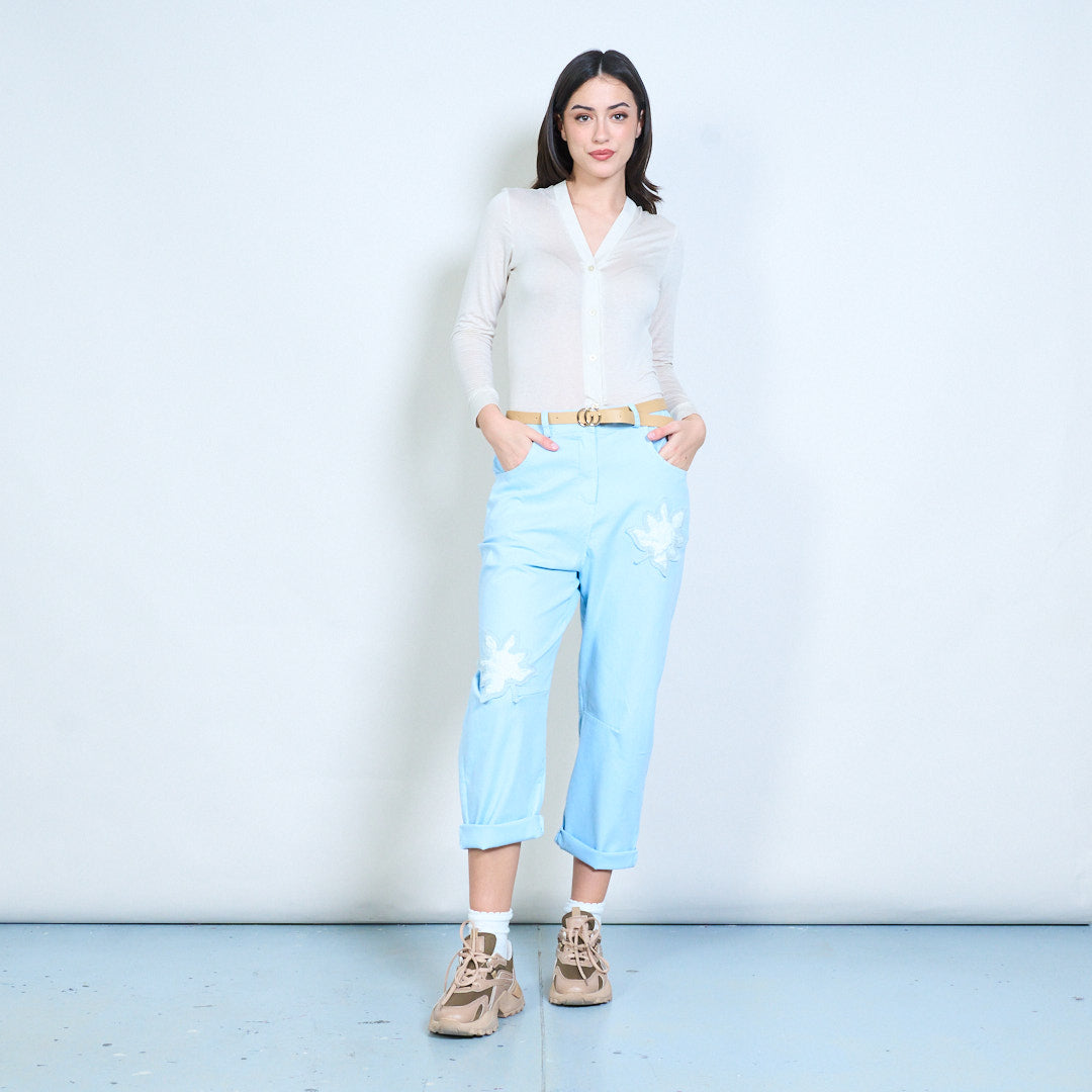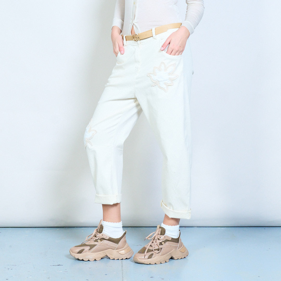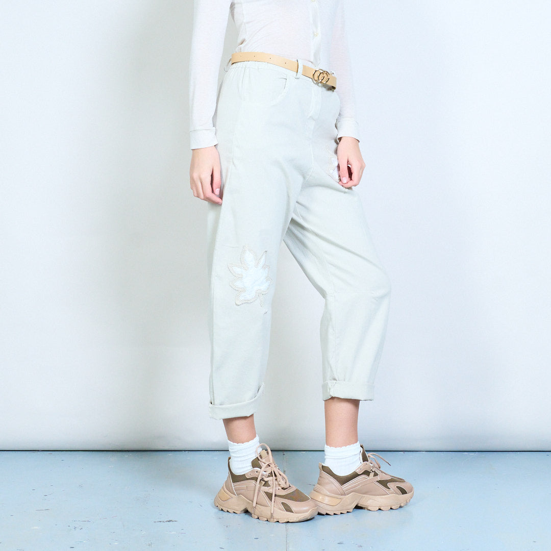 - Detalhe de aplique decorativo colocado na perna para interesse visual