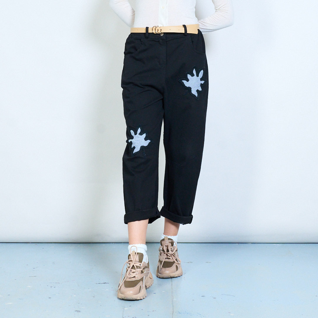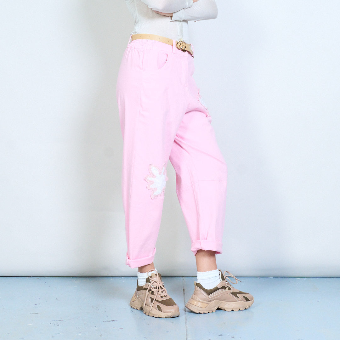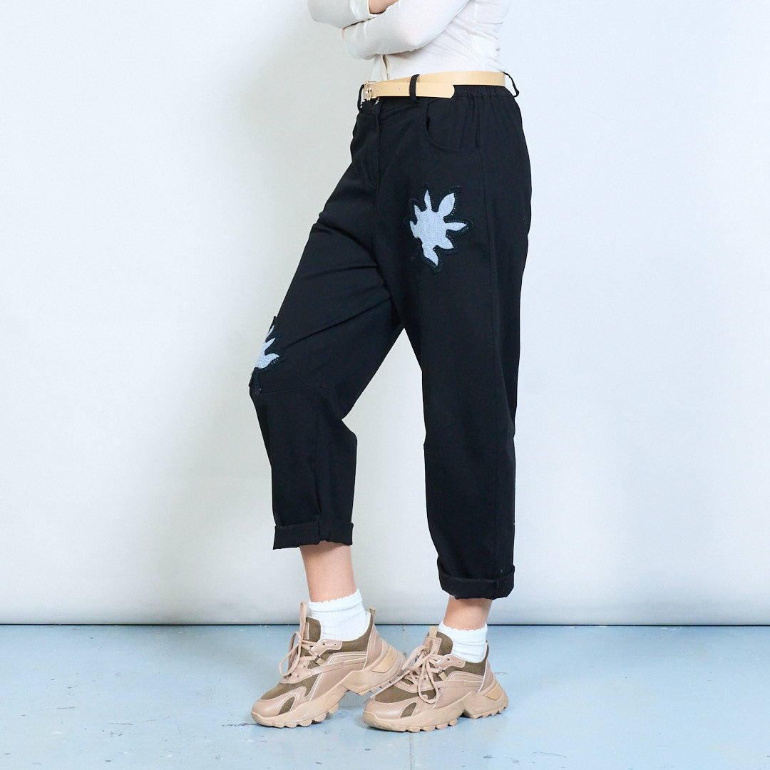Calças de corte relaxado com detalhe de aplique na cintura elástica no atacado