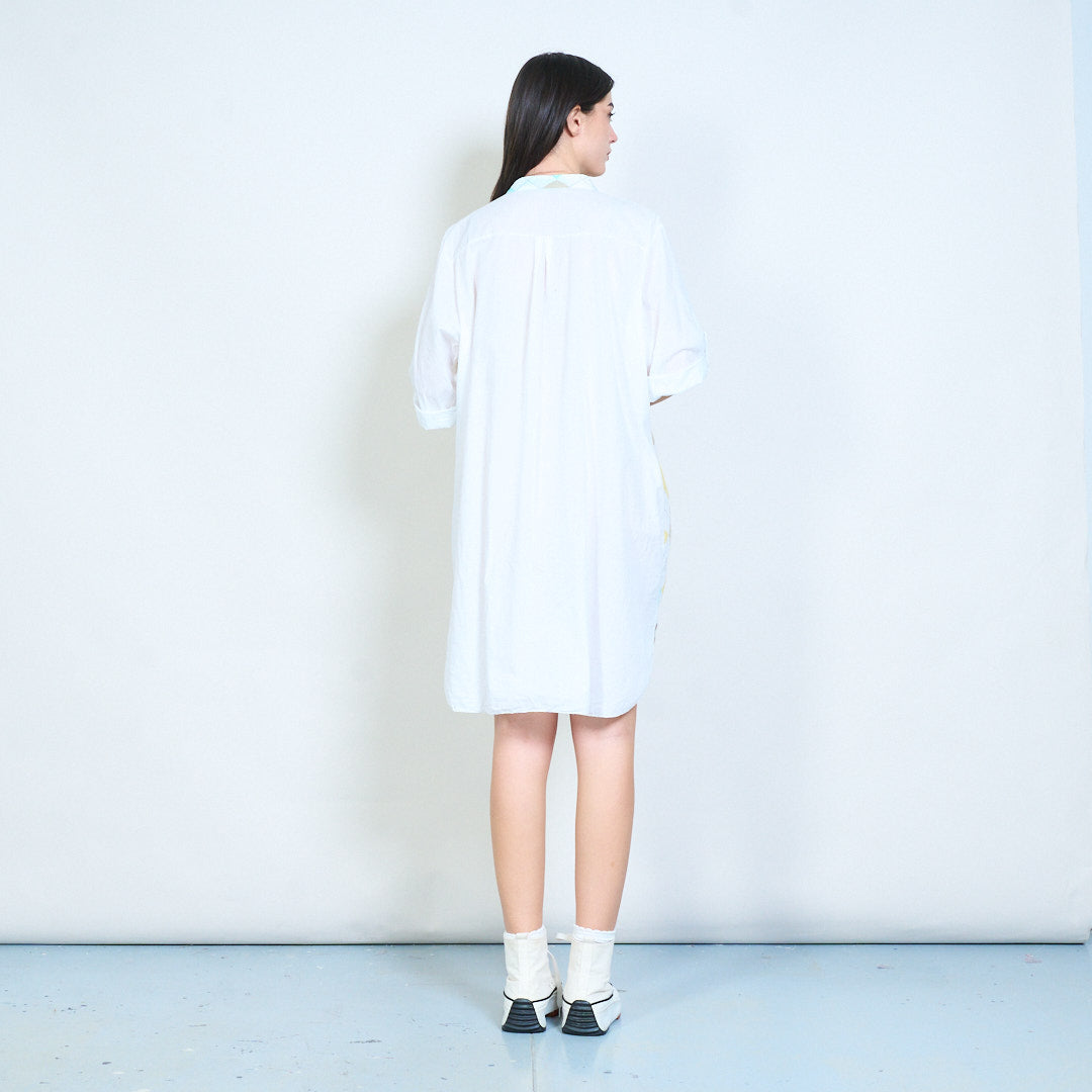 - Mangas compridas com detalhe de aba enrolada