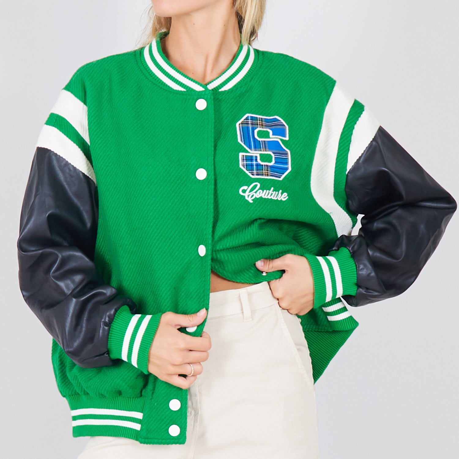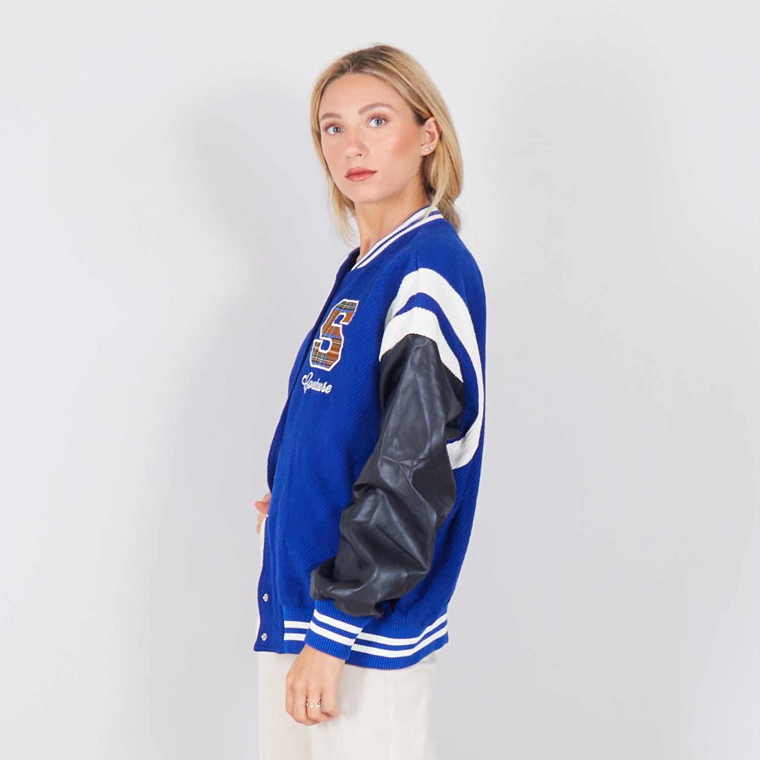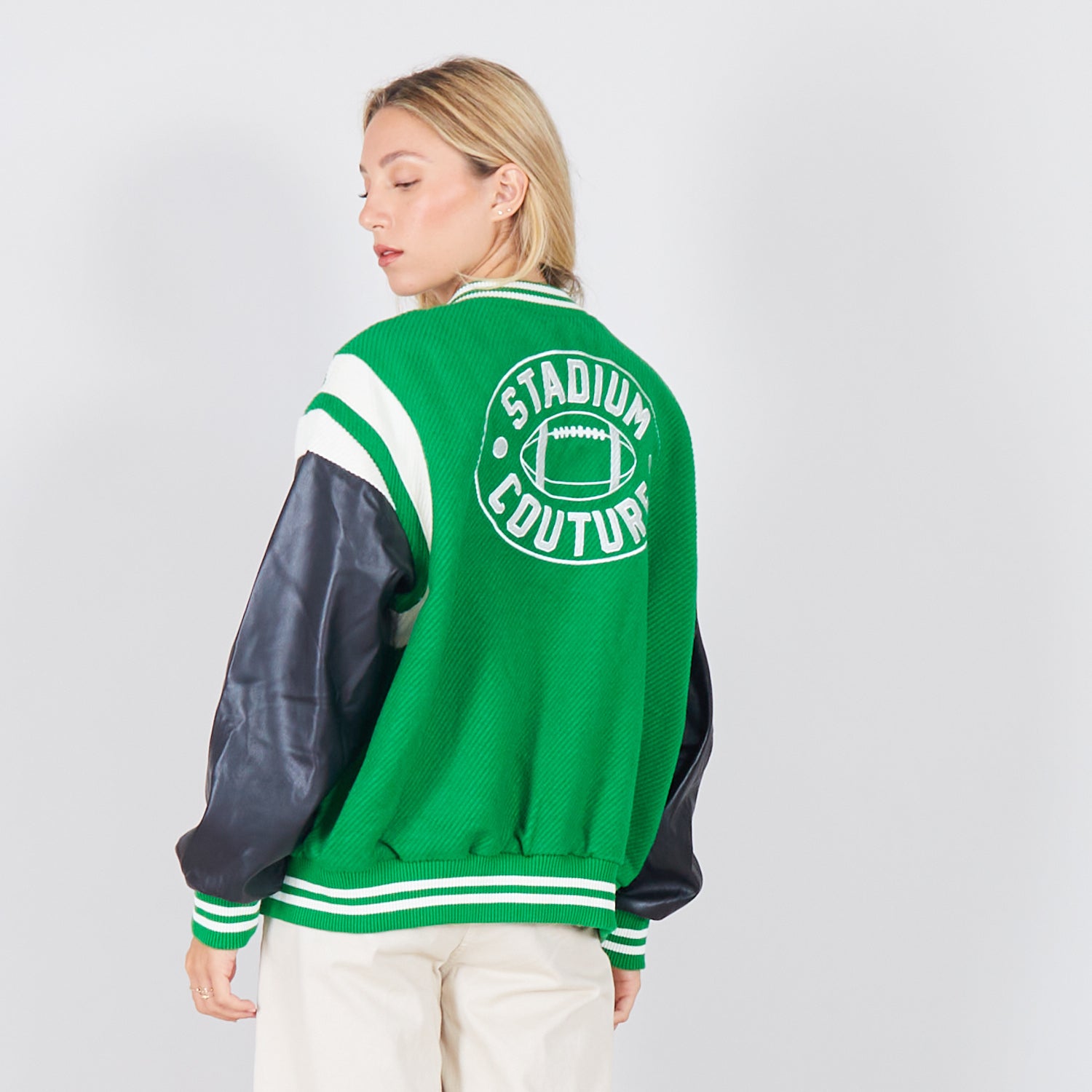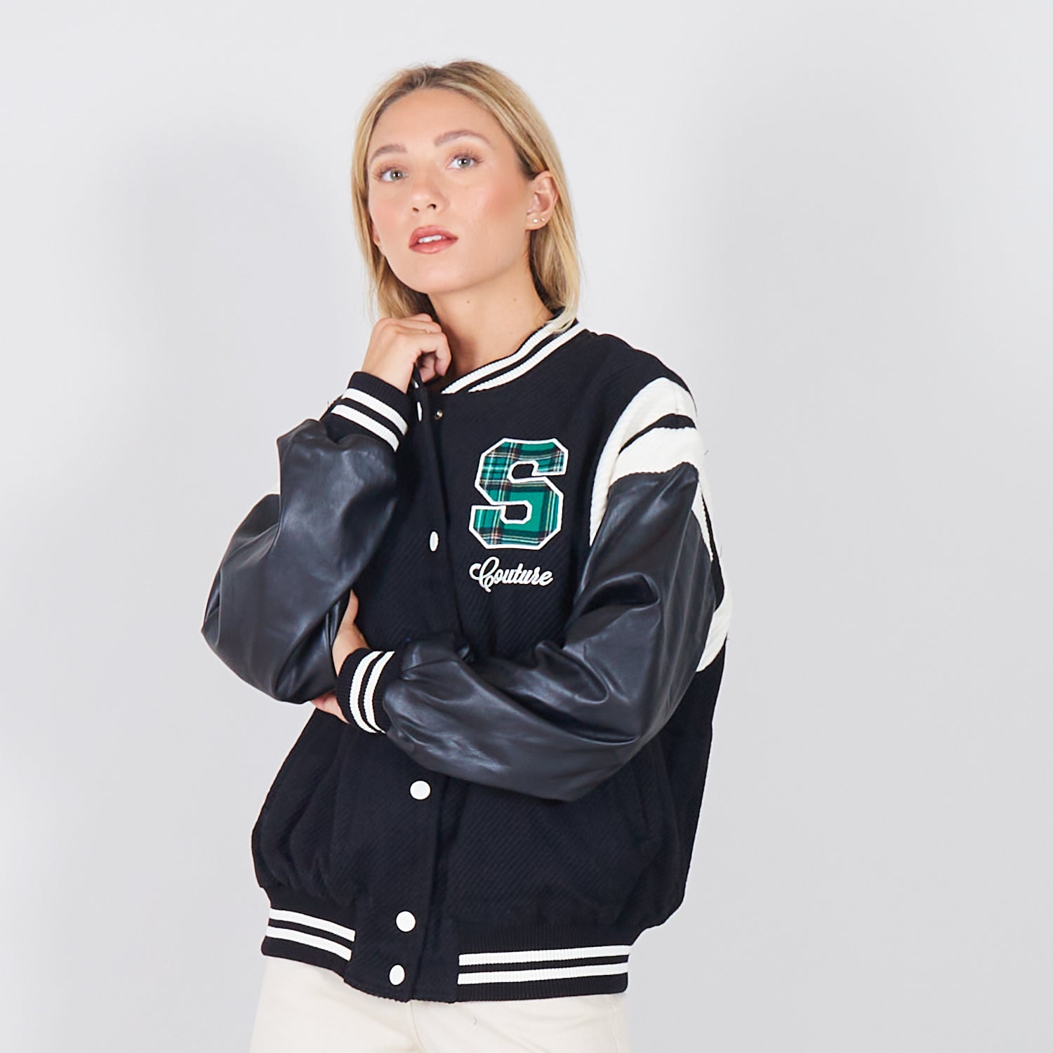 - Jaqueta de colagem com mangas de couro falso
