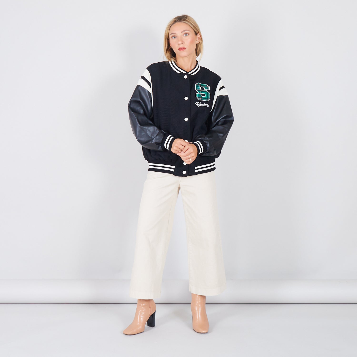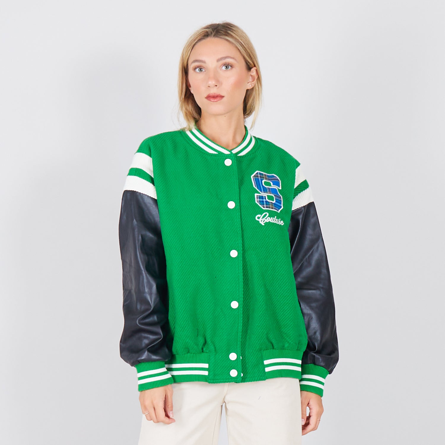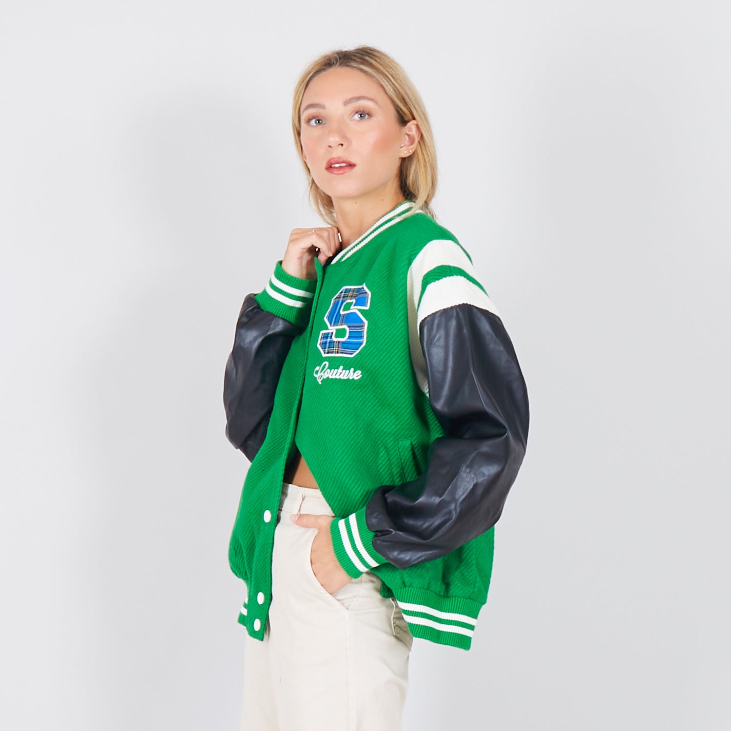 - Jaqueta de colagem com mangas de couro falso