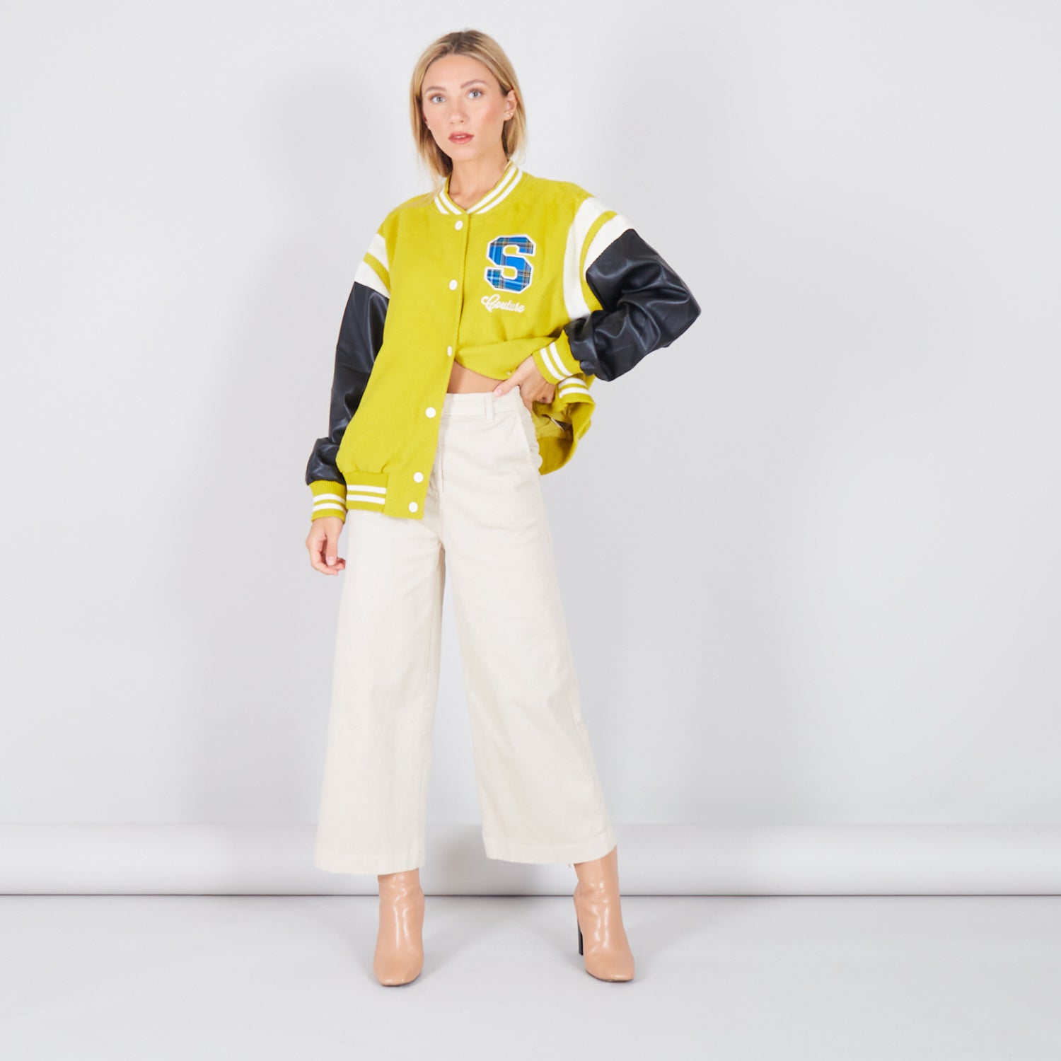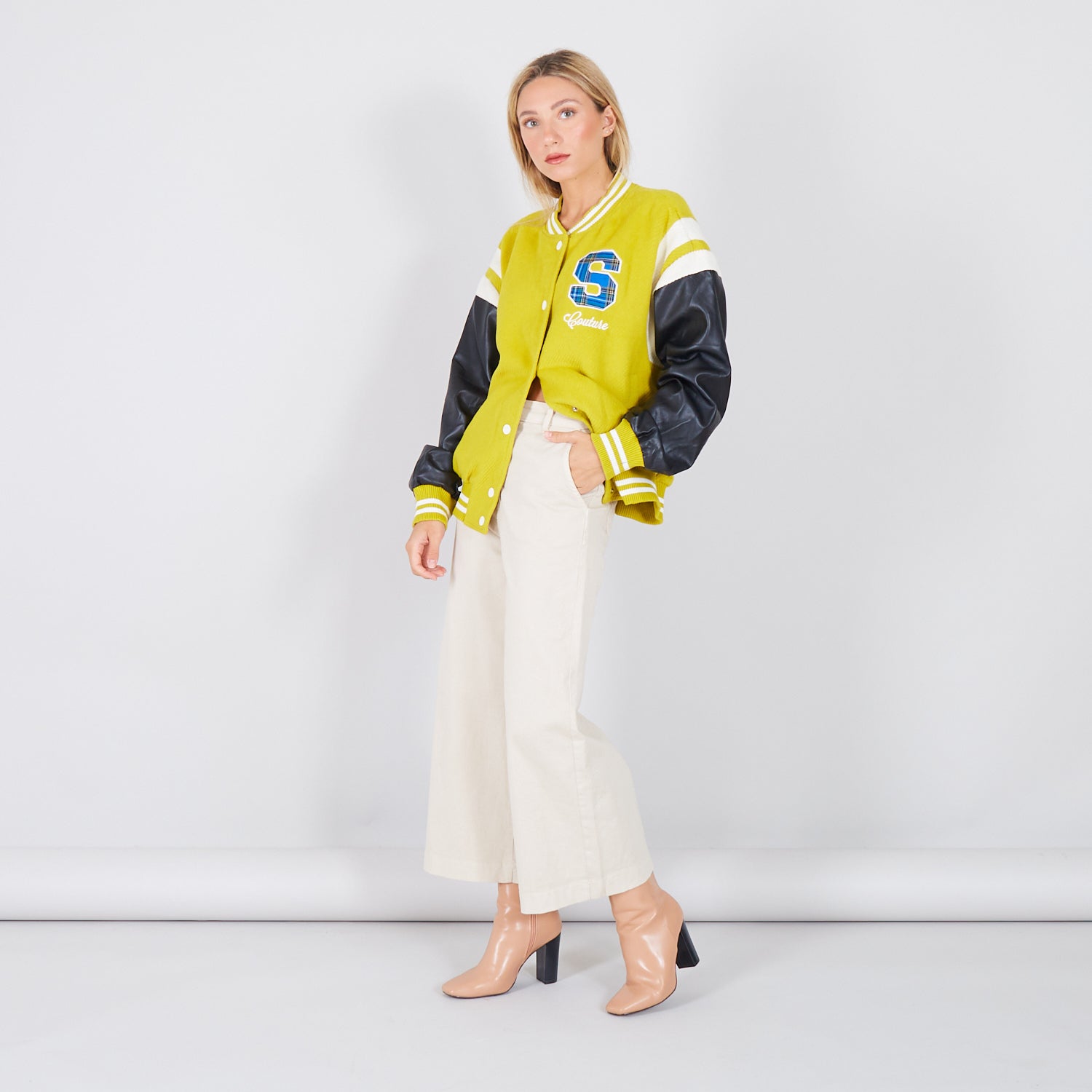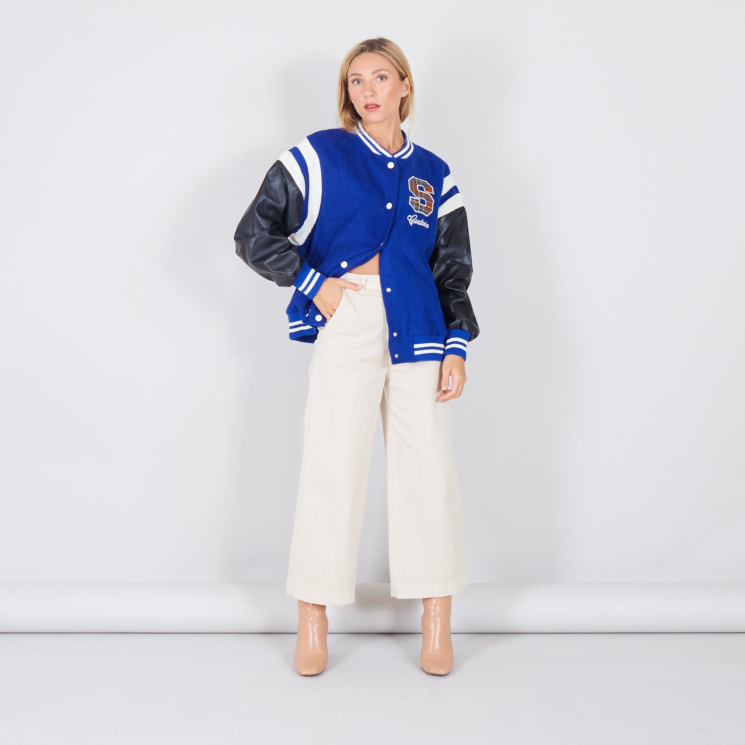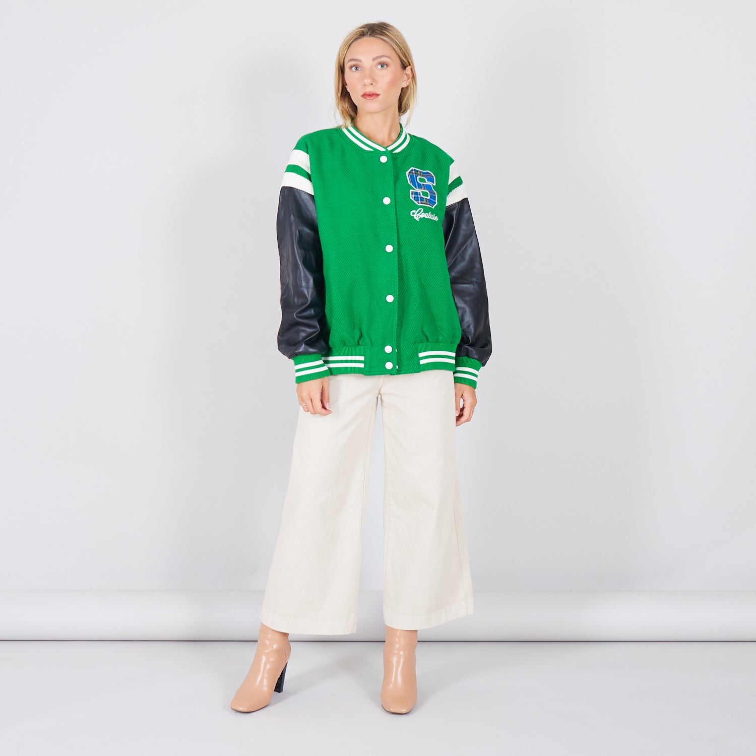 - Jaqueta de colagem com mangas de couro falso