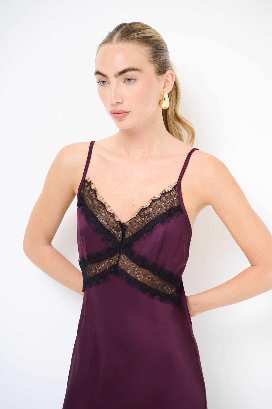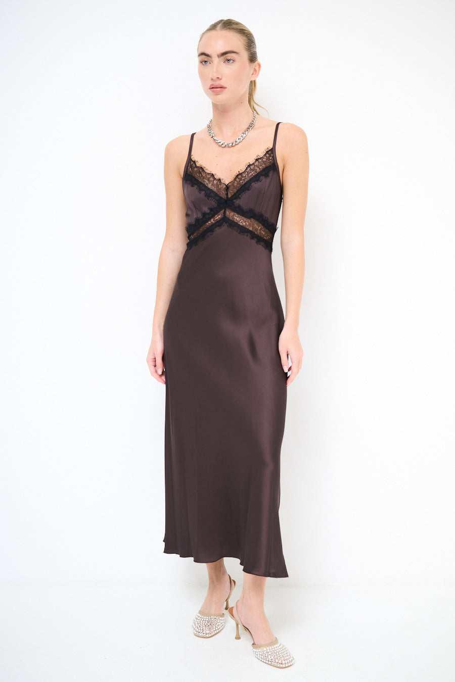 Атласное платье-комбинация миди с кружевной отделкой и бретельками оптом