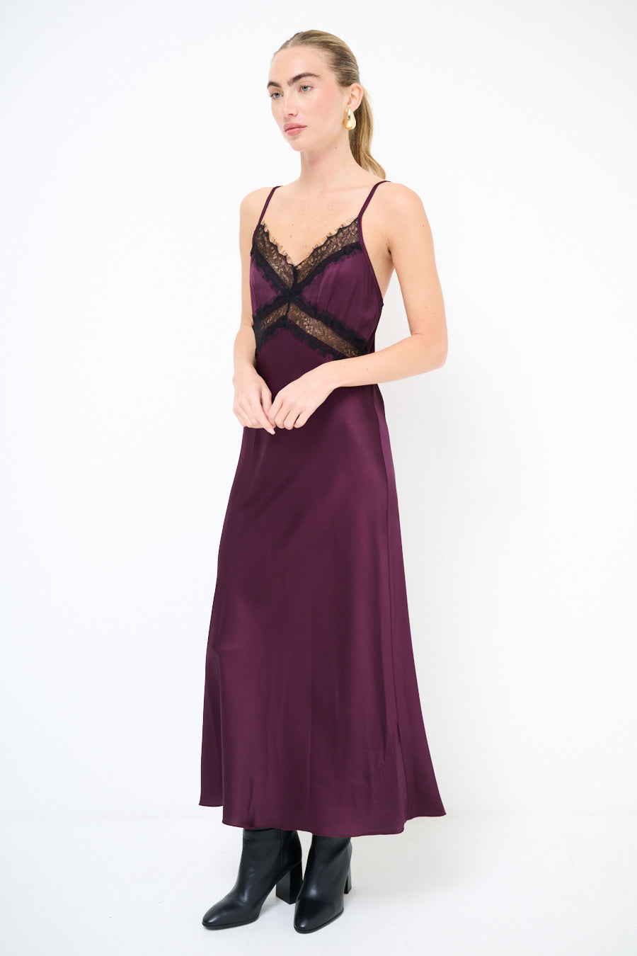- Гладкая атласная текстура создает роскошный и струящийся силуэт.