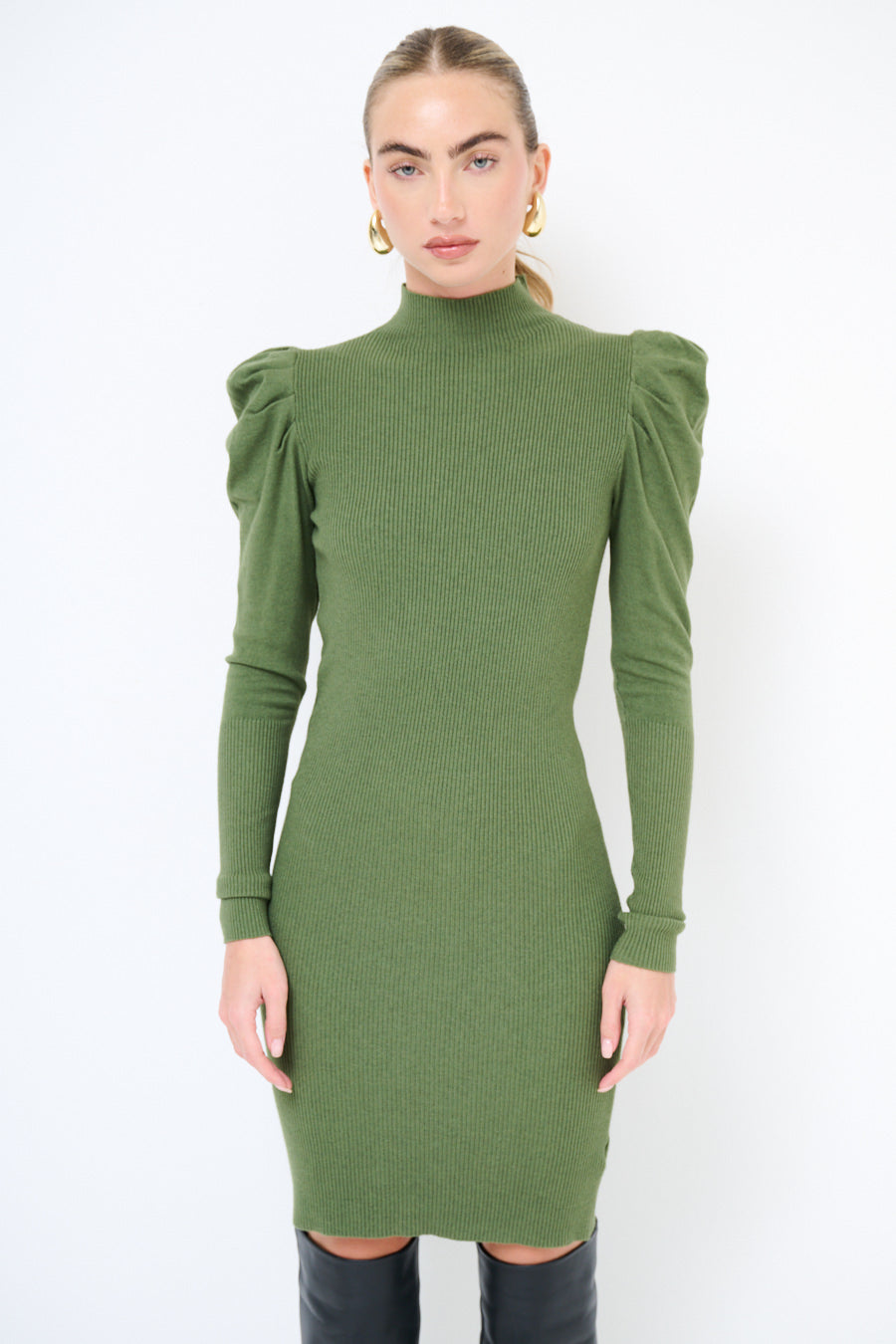 Облегающее трикотажное платье в рубчик с пышными плечами и высоким воротником оптом