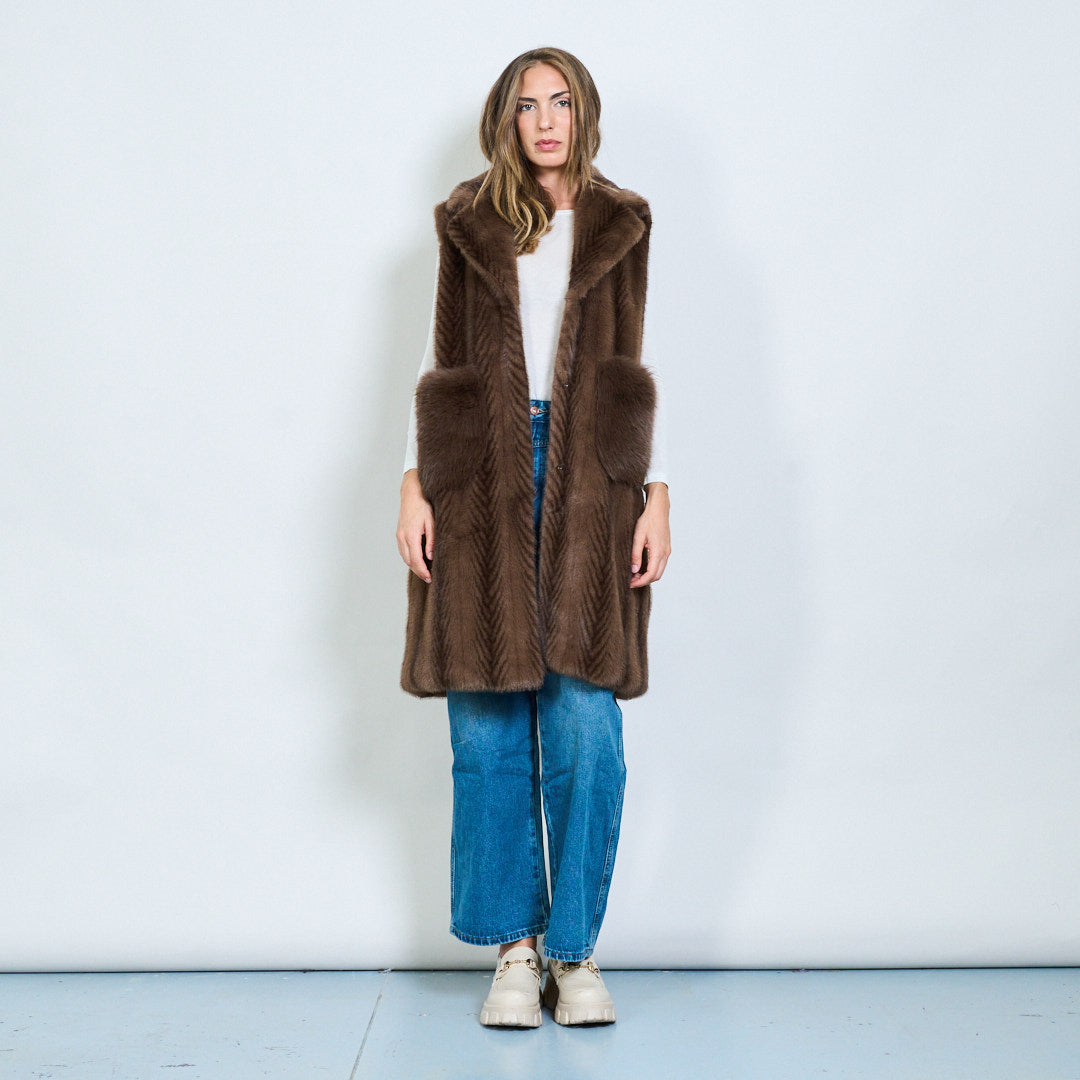 Длинной жилет с лоскутным мехом с полосатым мехом с лоскутными карманами оптом