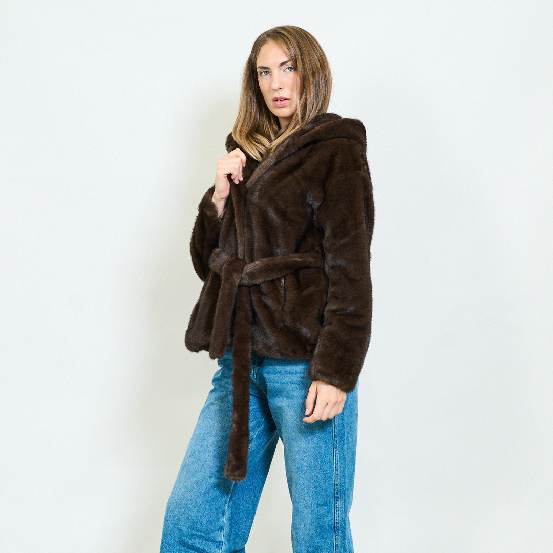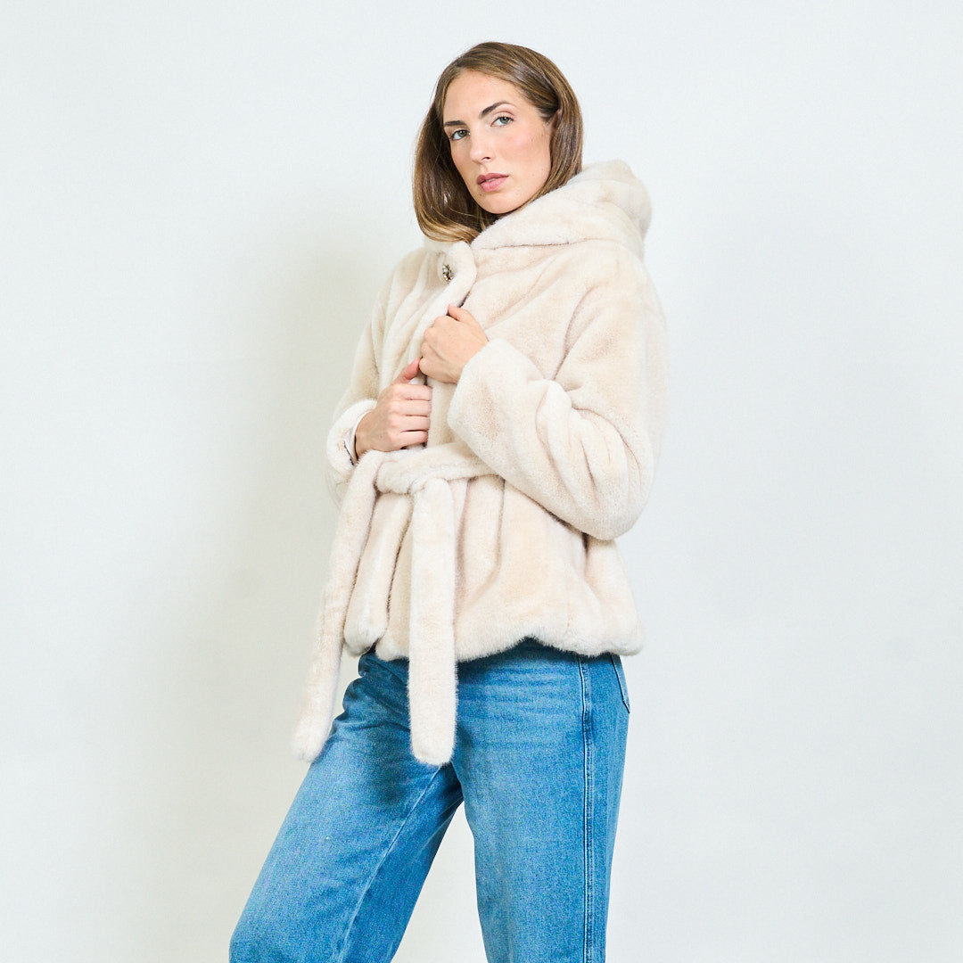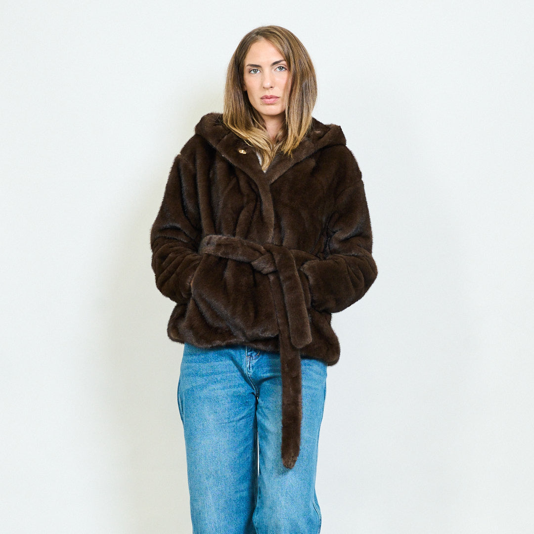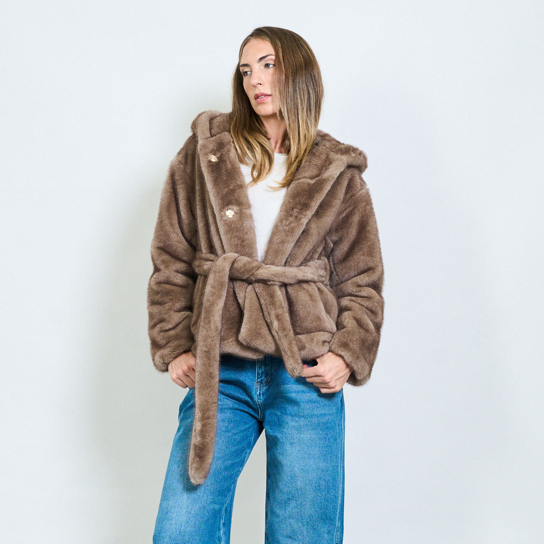 Скваживание из искусственного меха с капюшоном и хрустальными деталями оптом