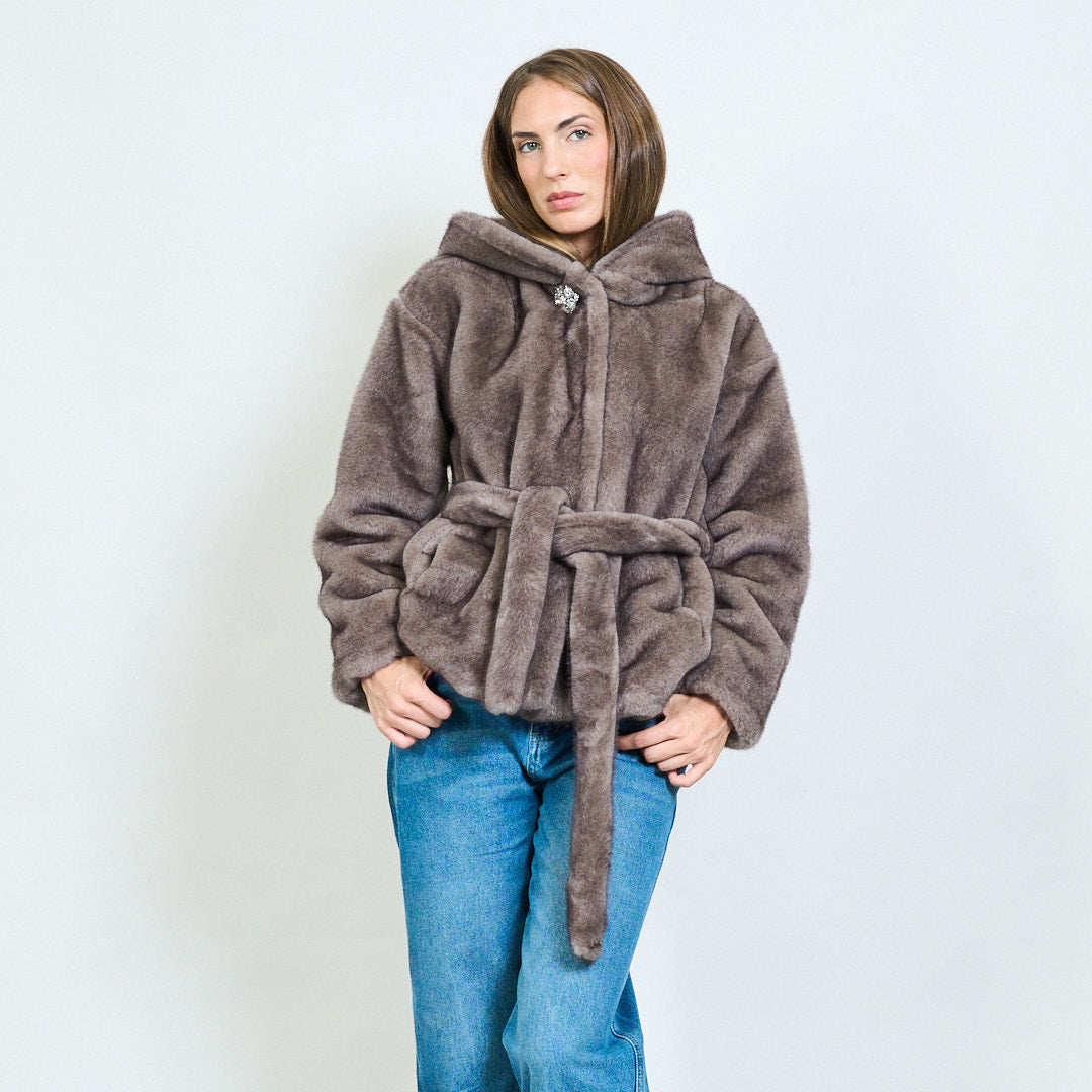 - Прикрепленный капюшон и хрустальная брошь детали на вырез