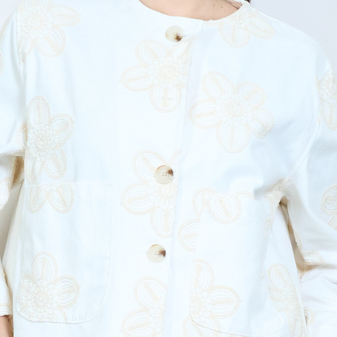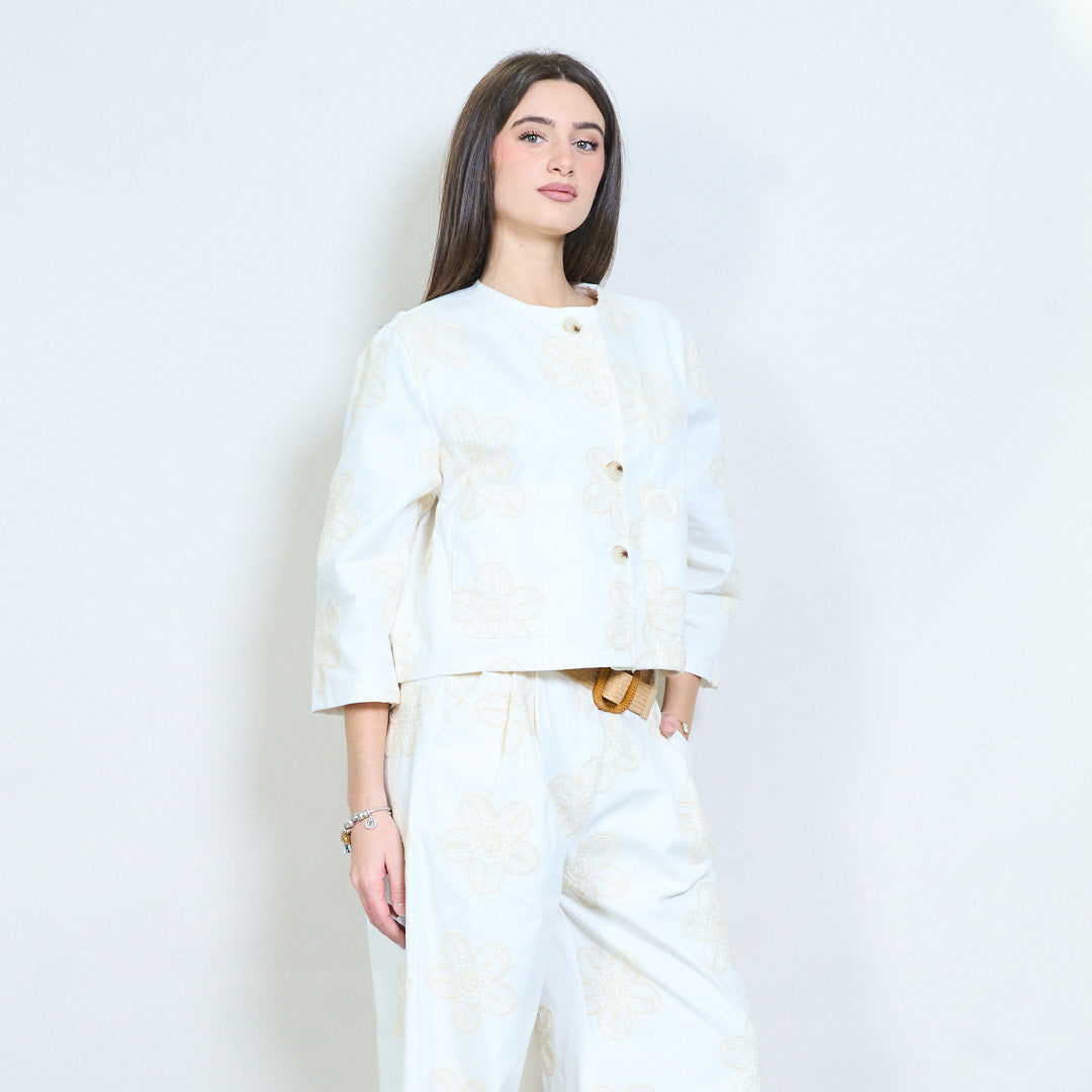 - Легкая куртка с цветочной вышивкой по всей поверхности.