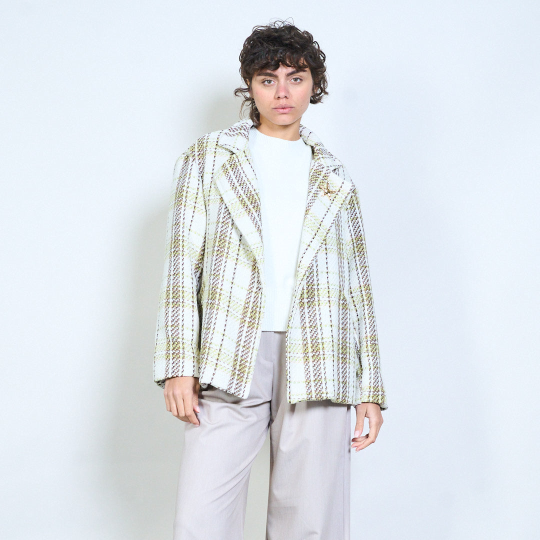 Фактурный твидовый пиджак с многострочным узором оконного стекла и брошью оптом