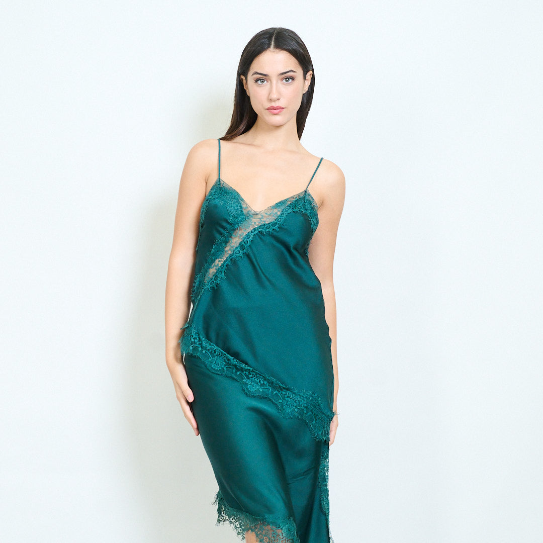 - Нежная кружевная отделка вдоль декольте и по краю создает элегантный женственный образ.