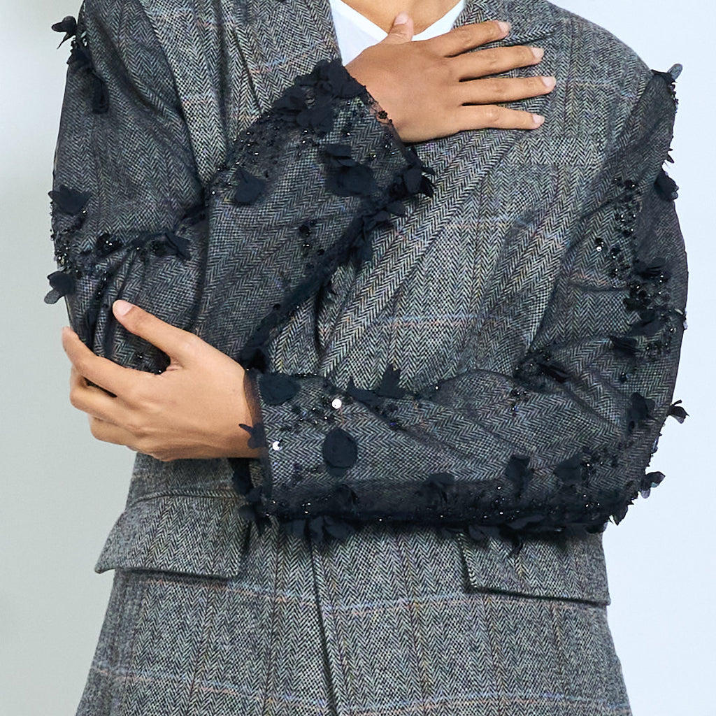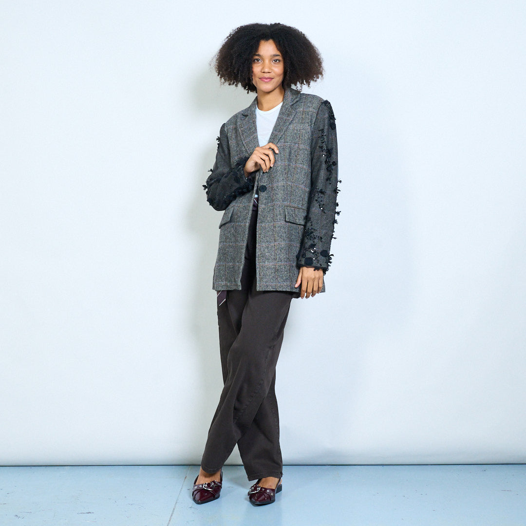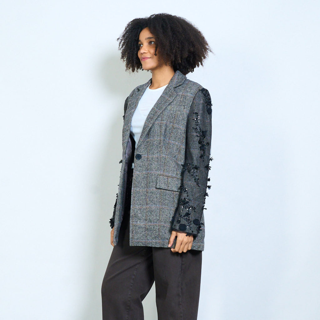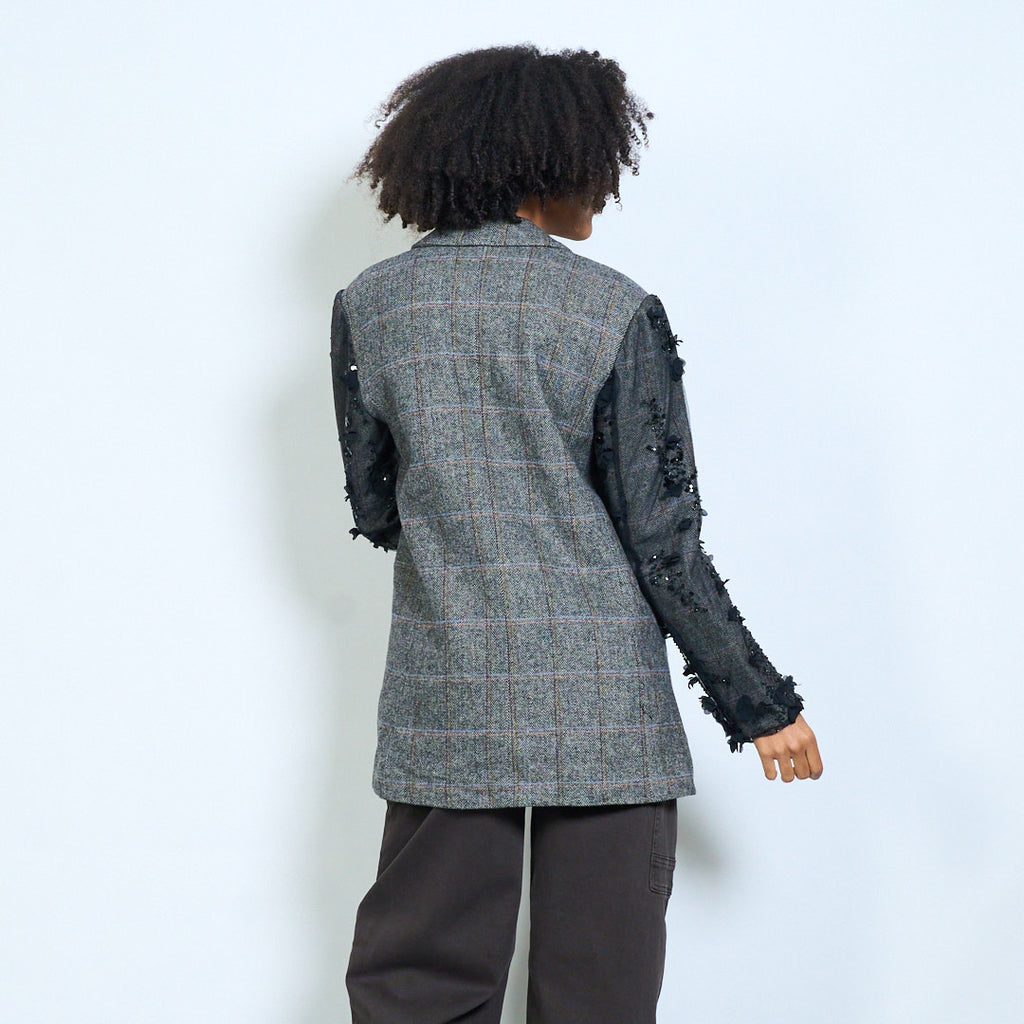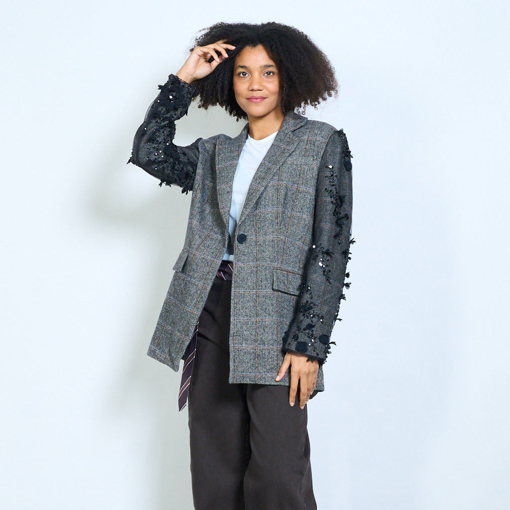 Блейзер на одной пуговице с узором «елочка» и декорированными сетчатыми рукавами оптом