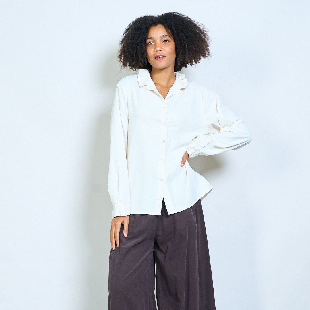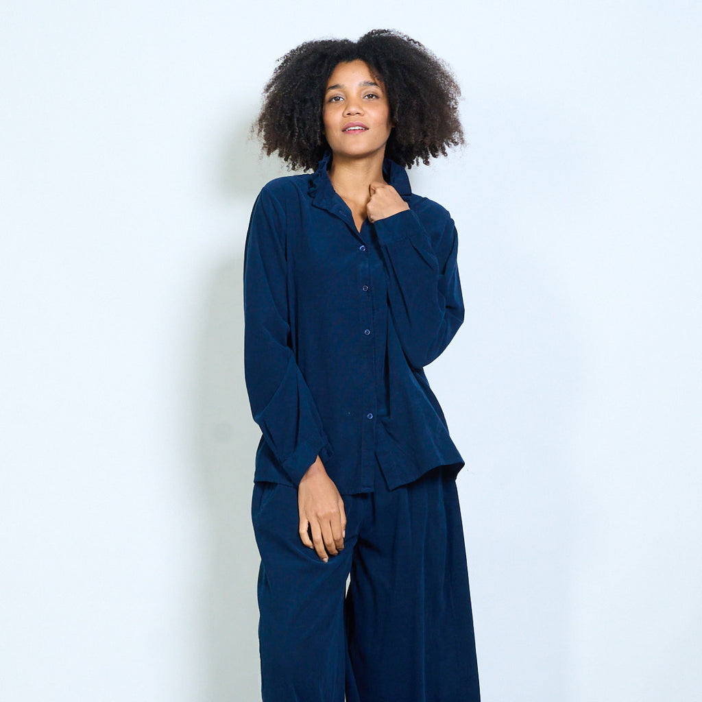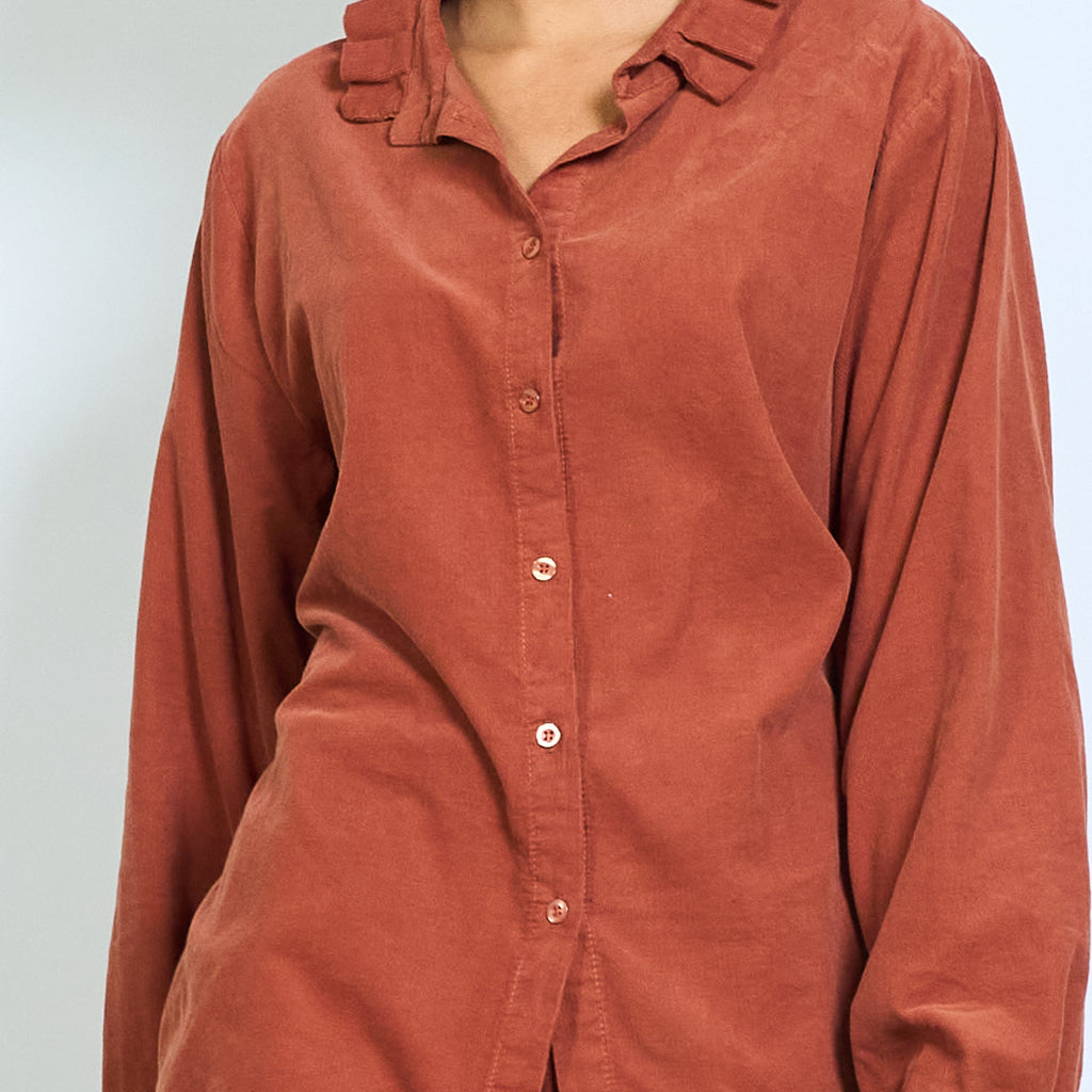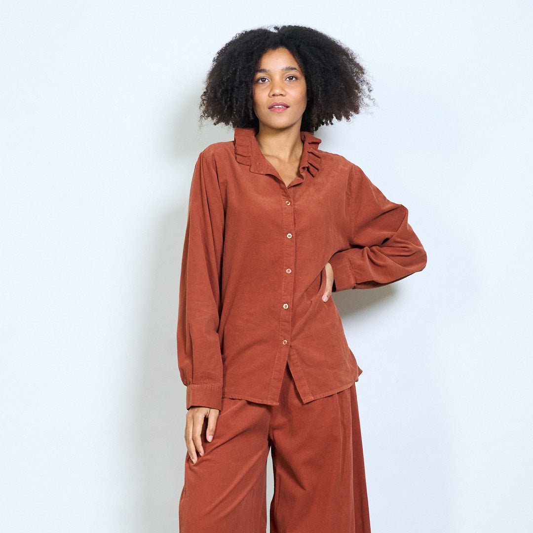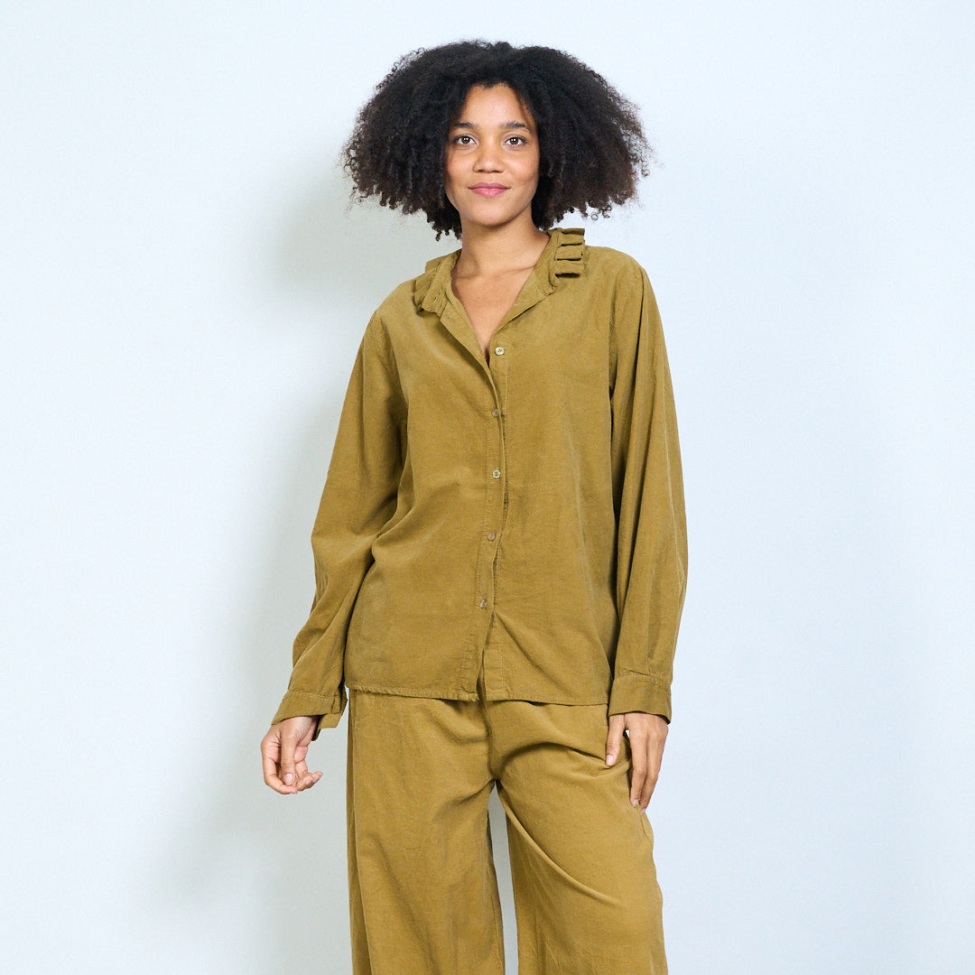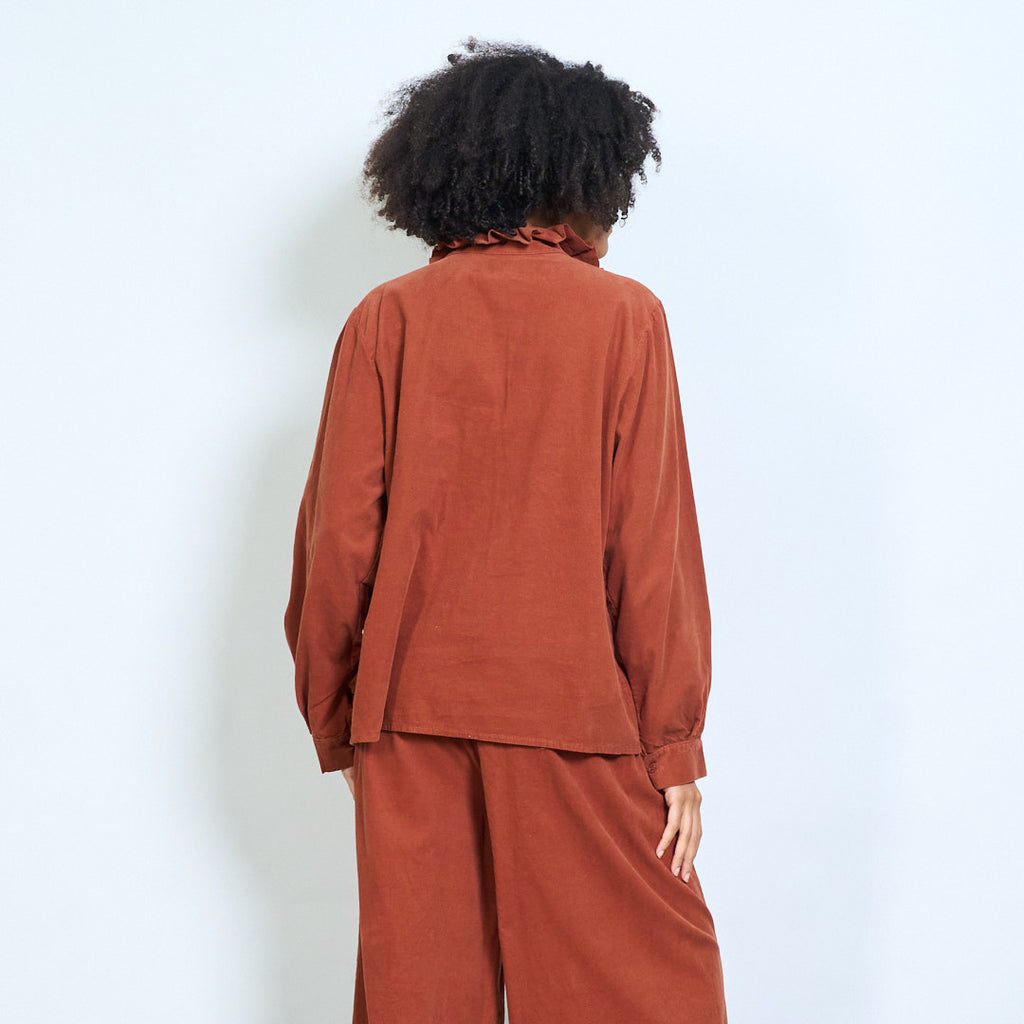 Вельветовая блузка с длинными рукавами и воротником с рюшами на пуговицах оптом