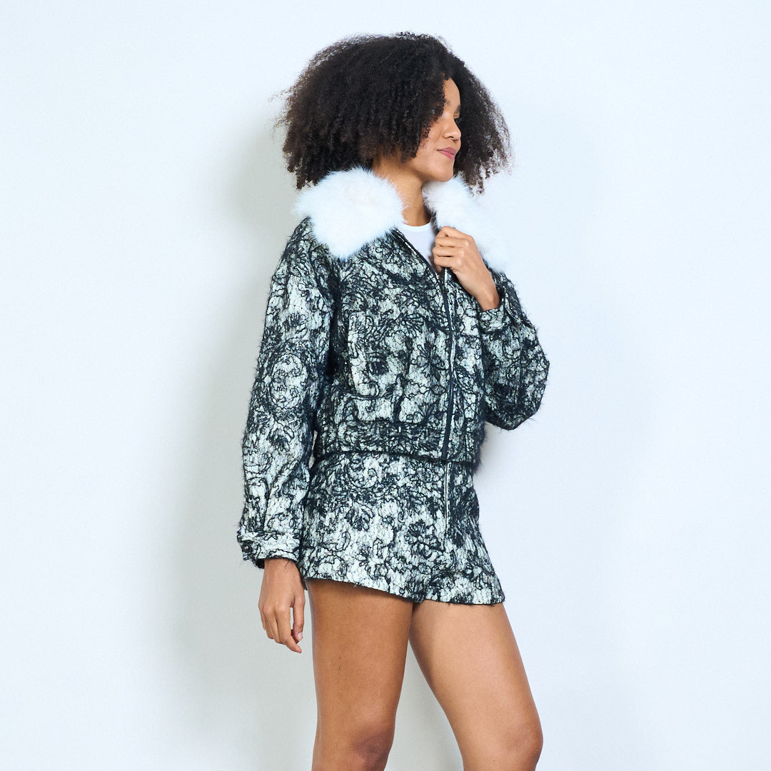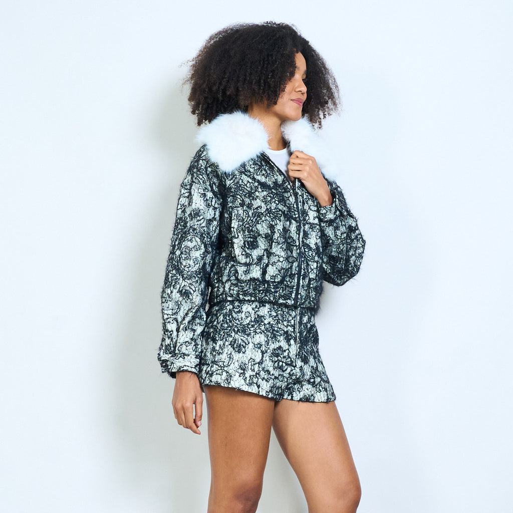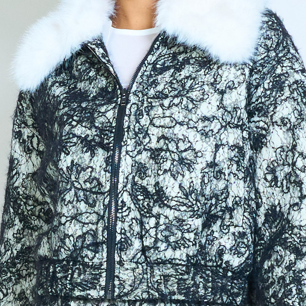 Кружевная фактурная куртка на молнии с объемным воротником из искусственного меха оптом