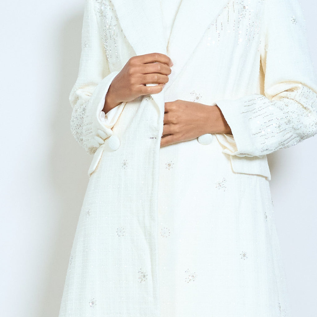 - Двубортный перед с закрытыми пуговицами подчеркивает изысканность образа.