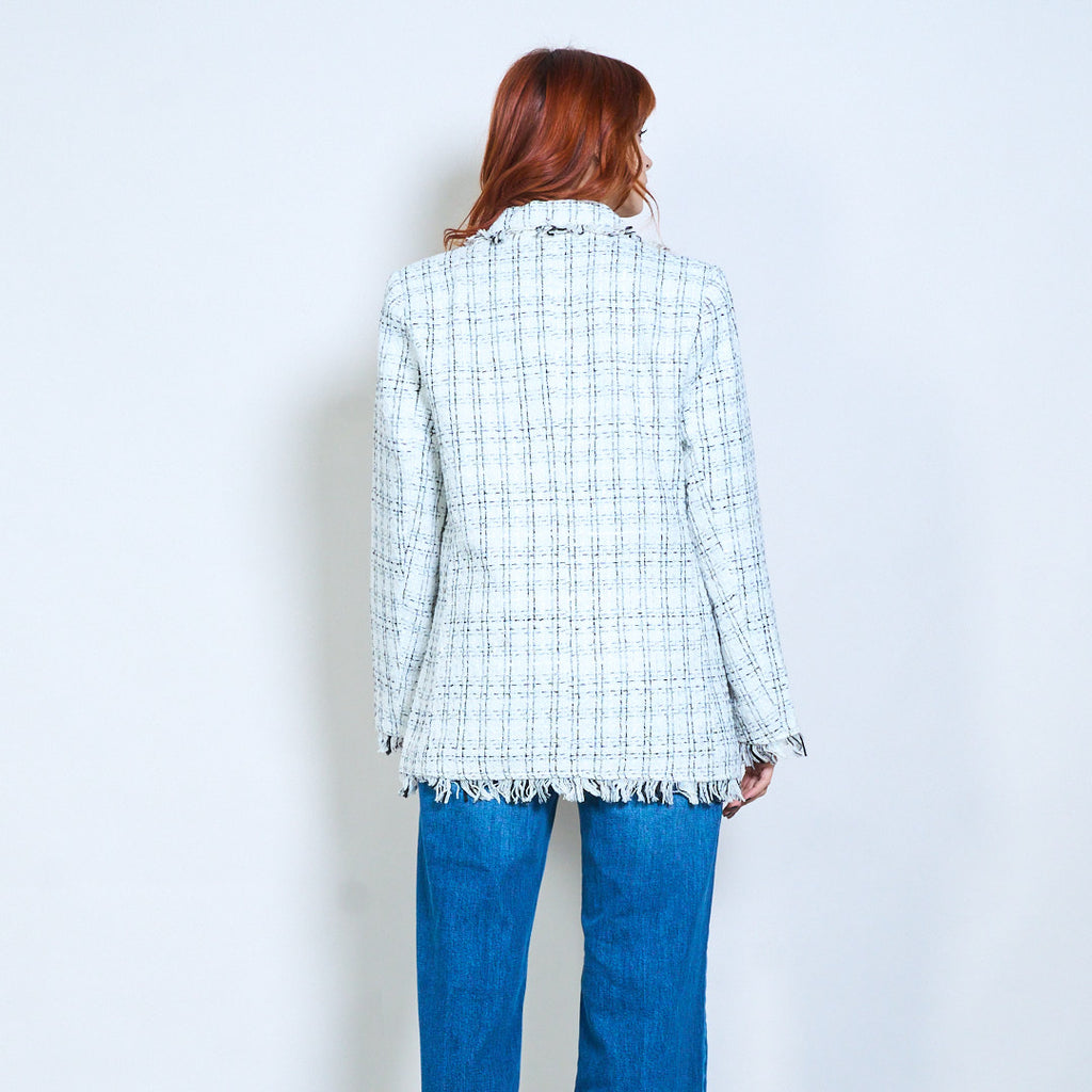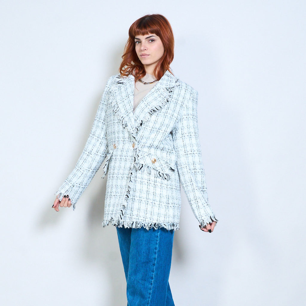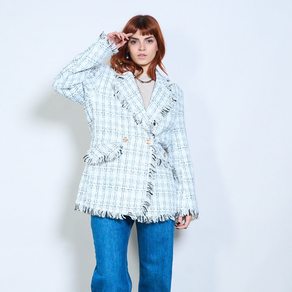 - Изысканный твидовый пиджак в клетку, украшенный бахромой.