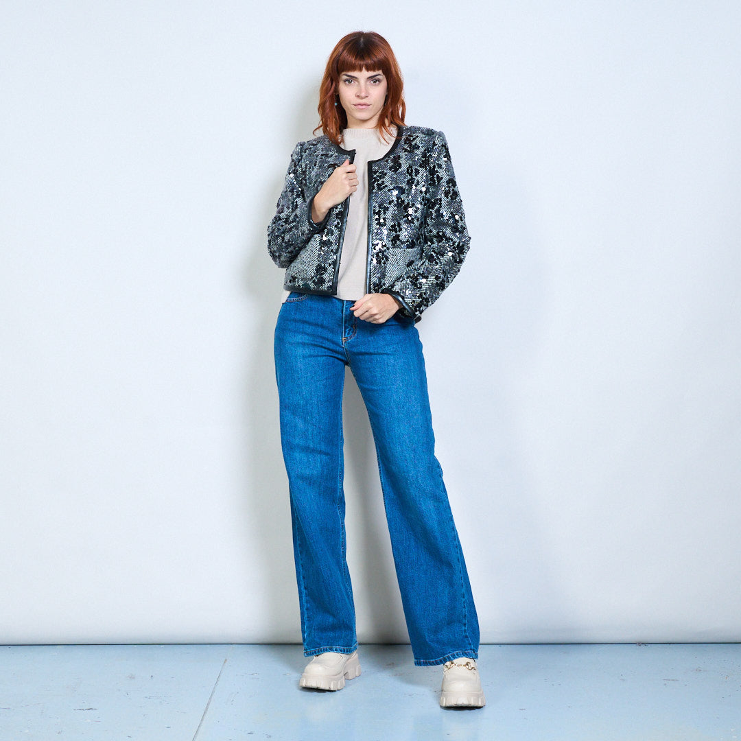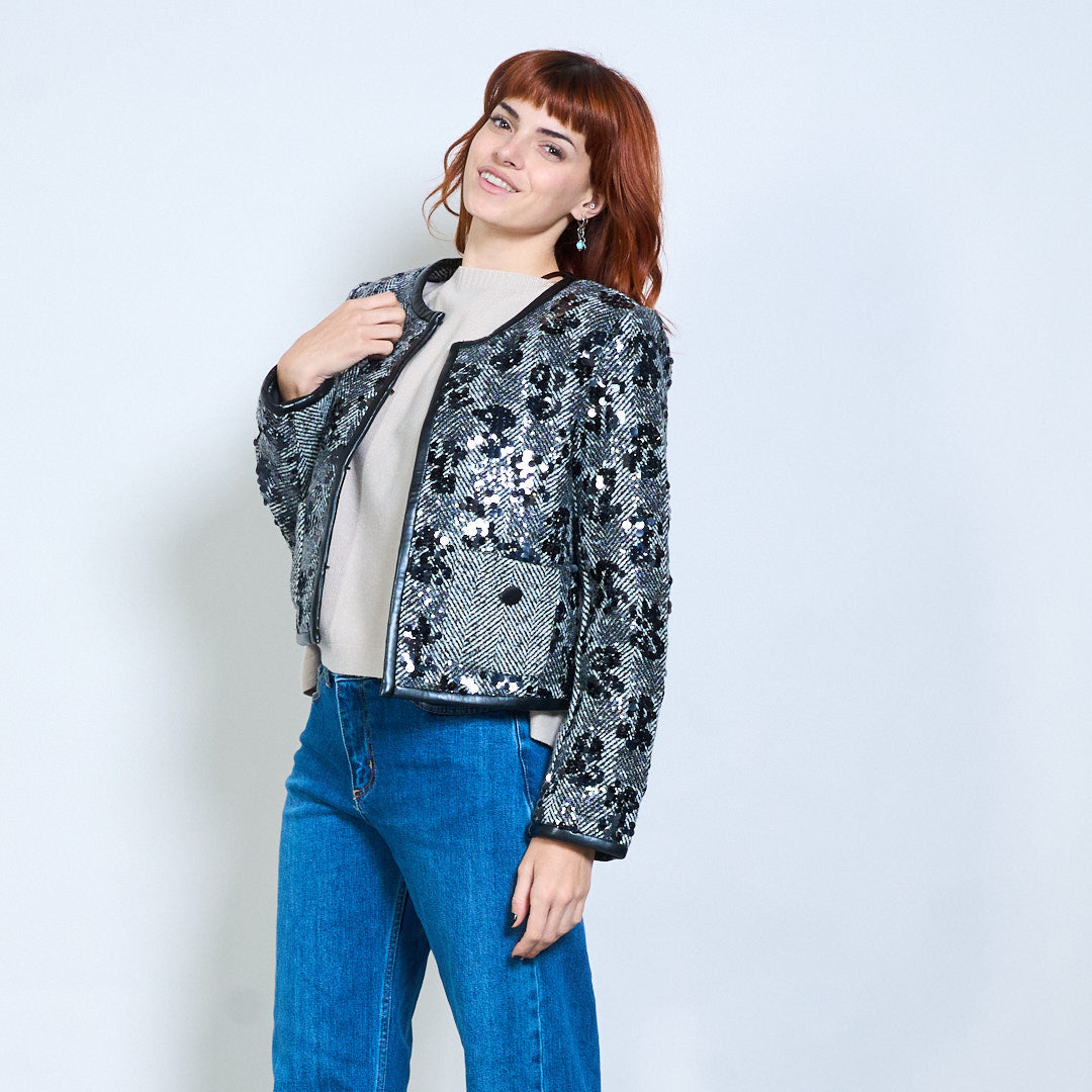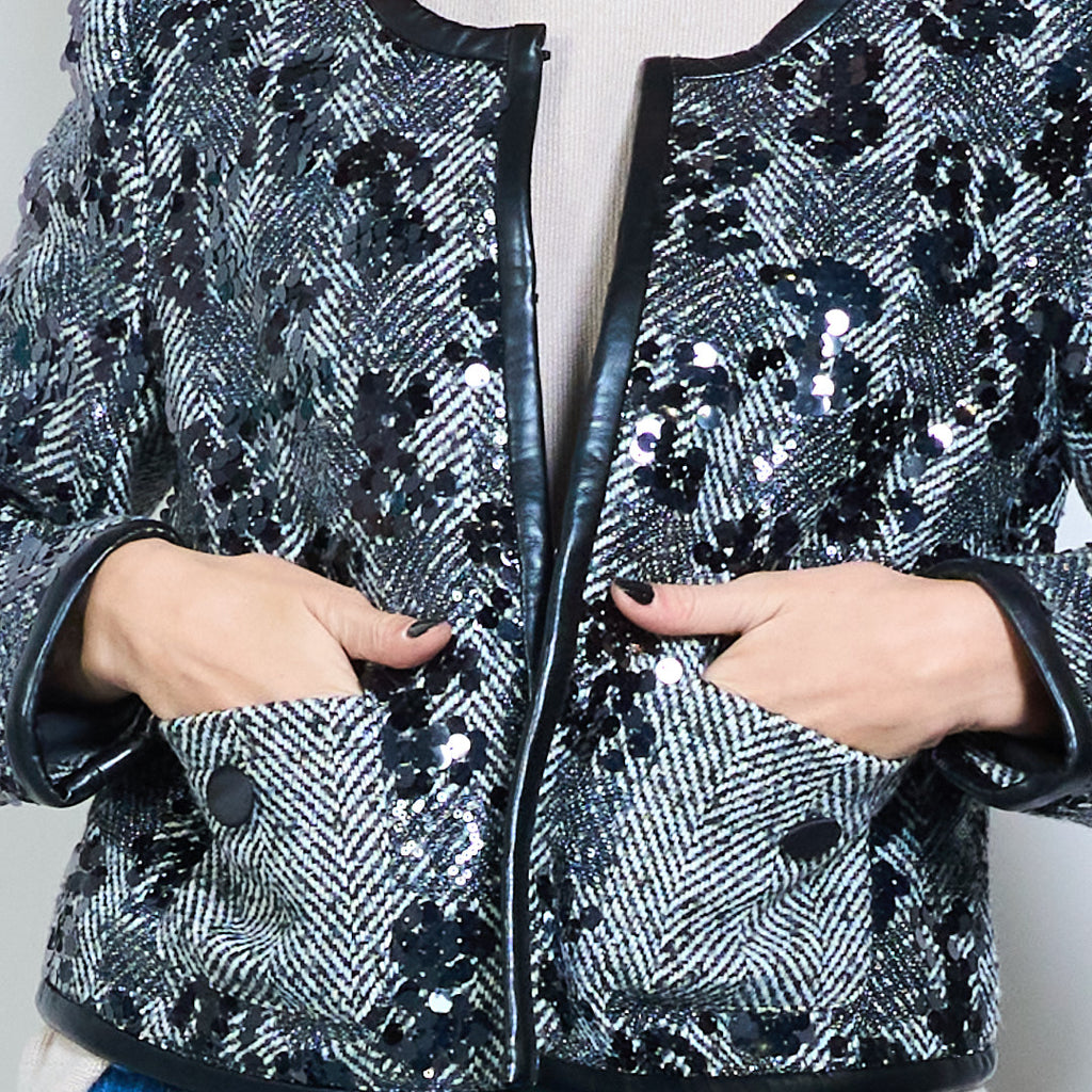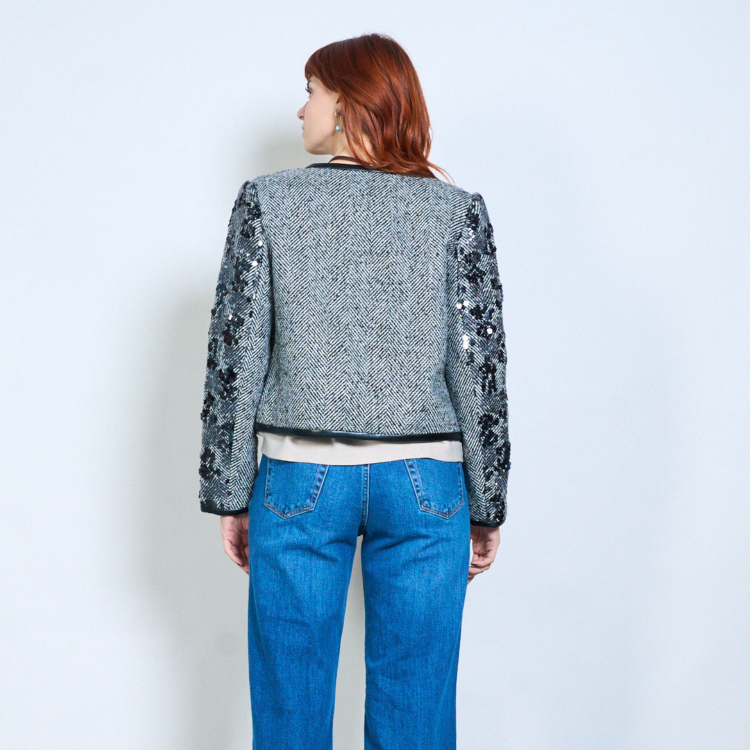 - Элегантный твидовый жакет в клетку, расшитый замысловатыми пайетками.