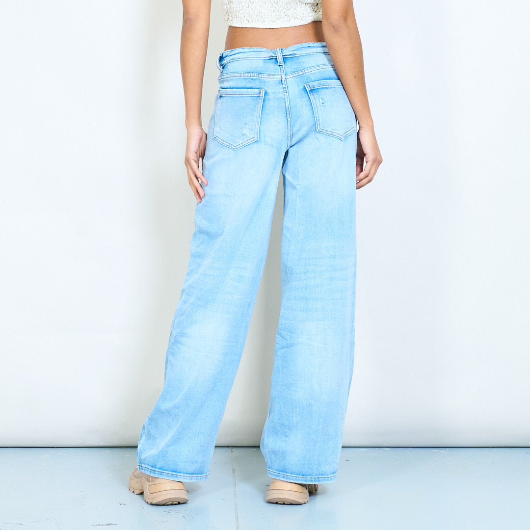 Джинсы из потертого денима с высокой талией, широкими штанинами и перекрученным поясом оптом