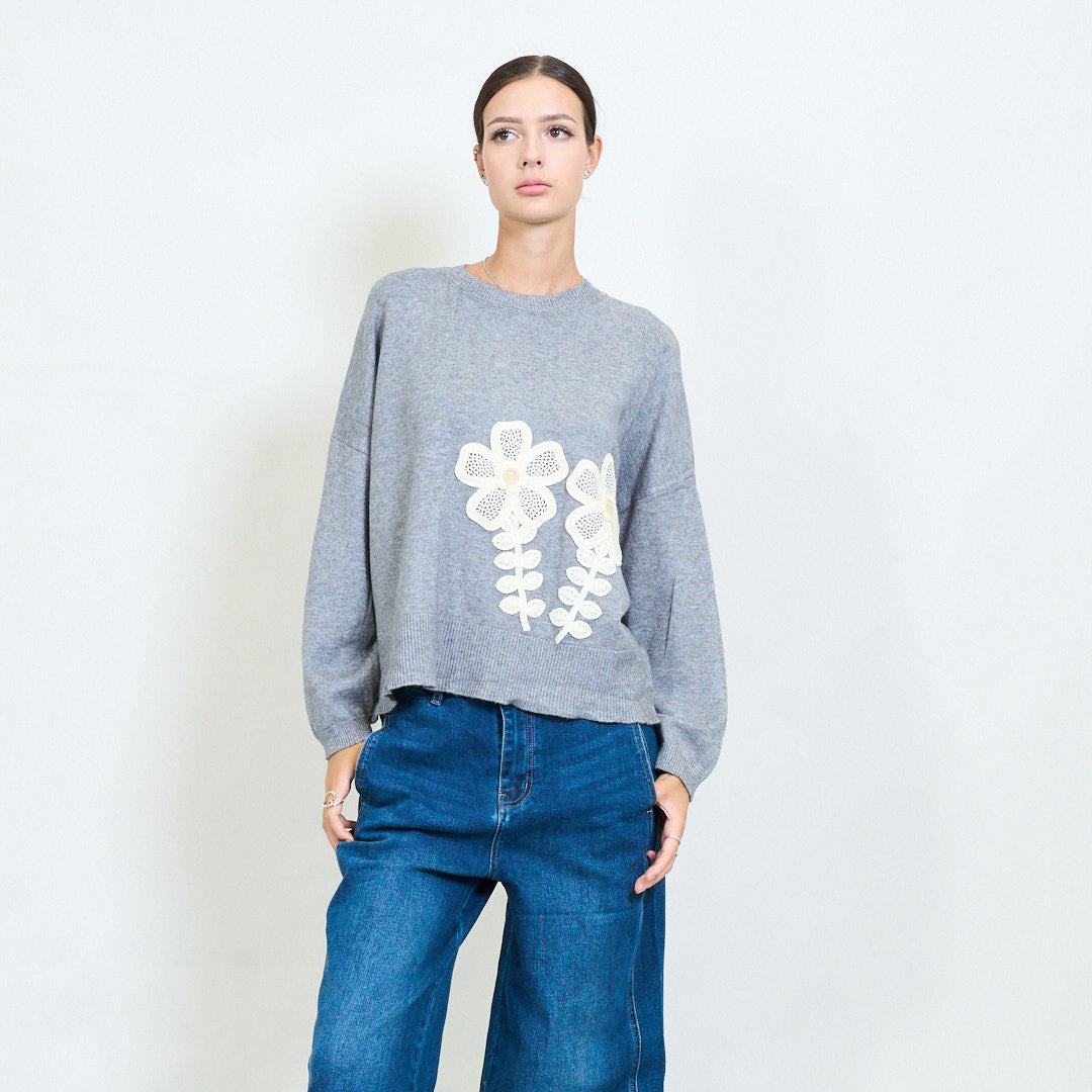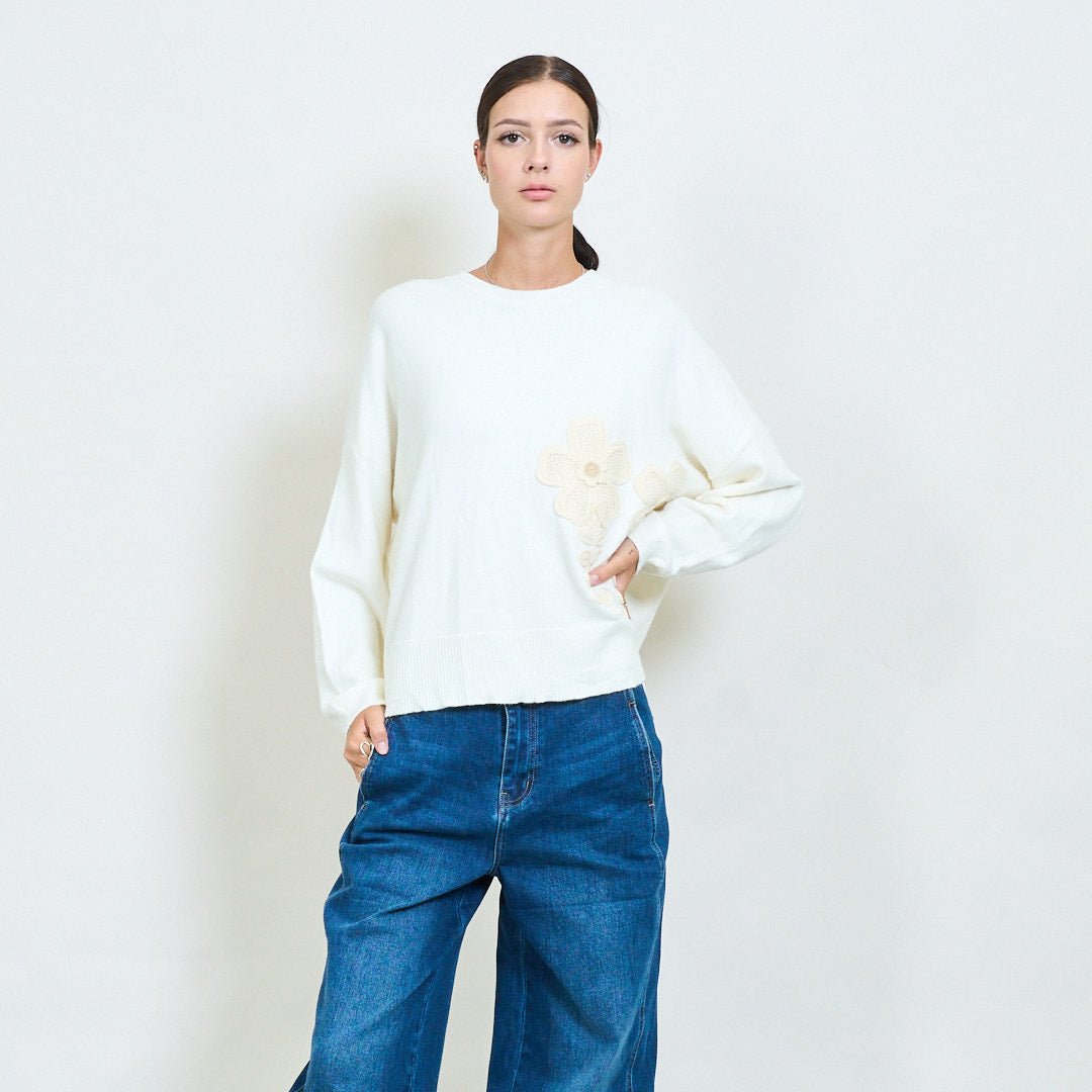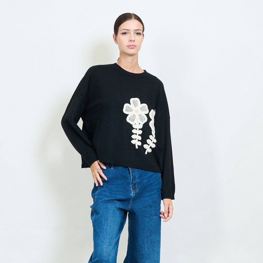 - Большая цветочная аппликация на передней части добавляет уникальность