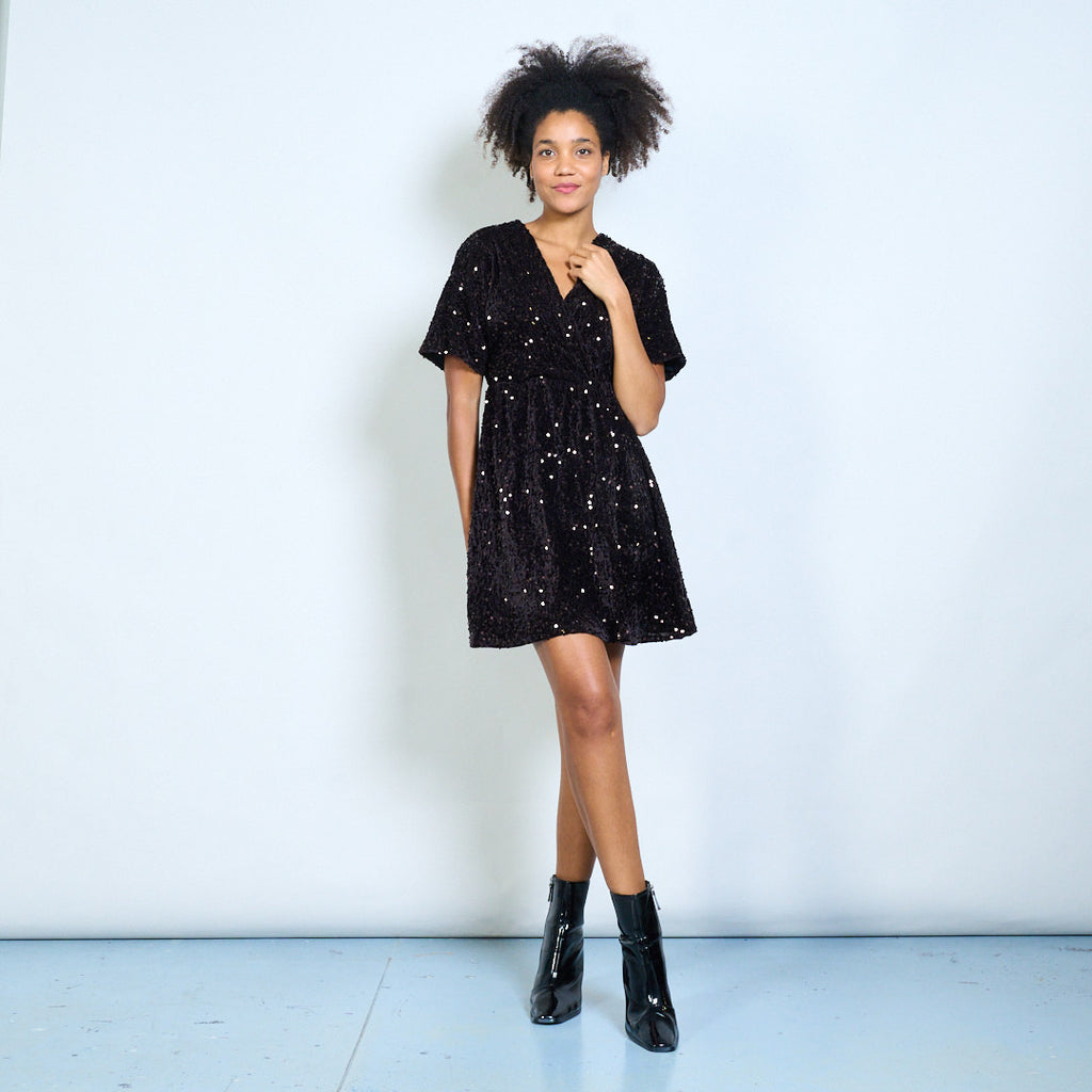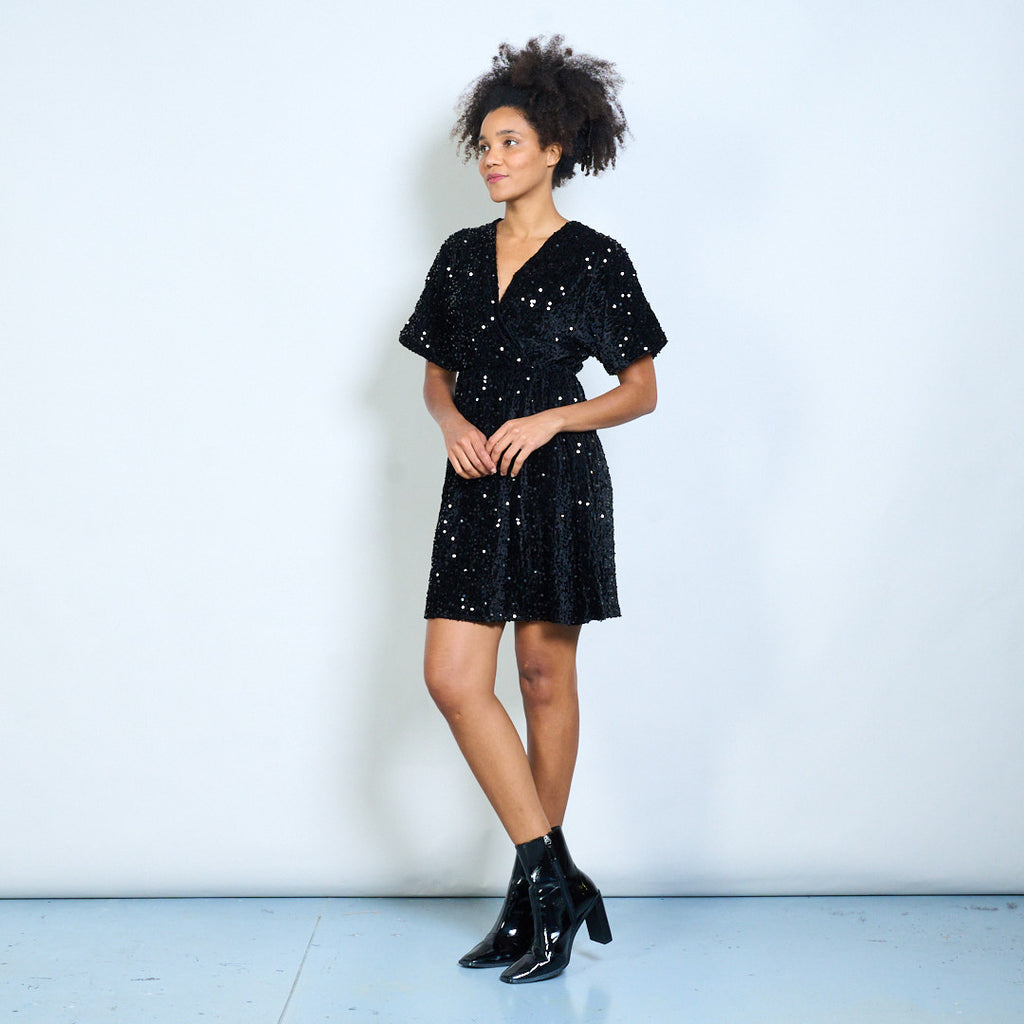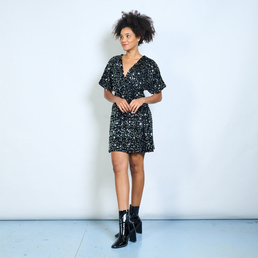 Мини-платье с v-образным вырезом и короткими рукавами, украшенное блестками, оптом