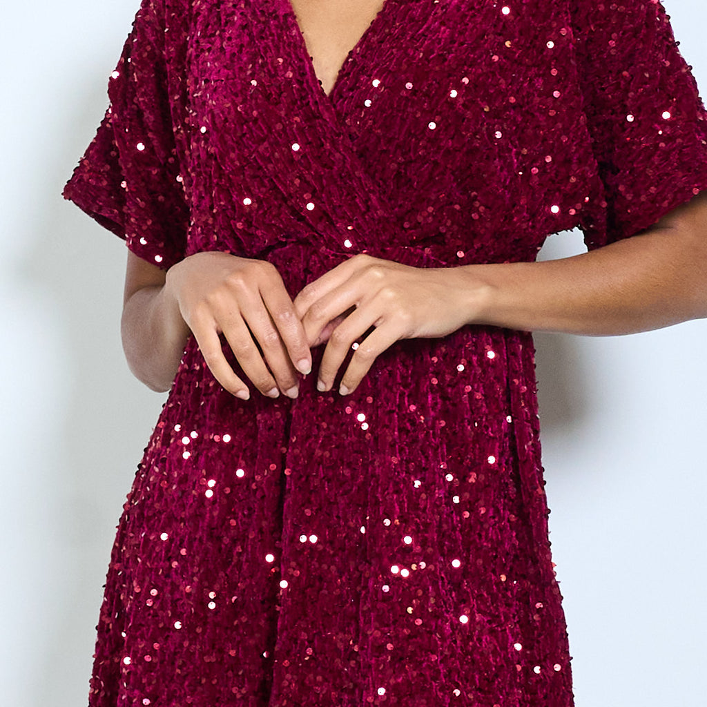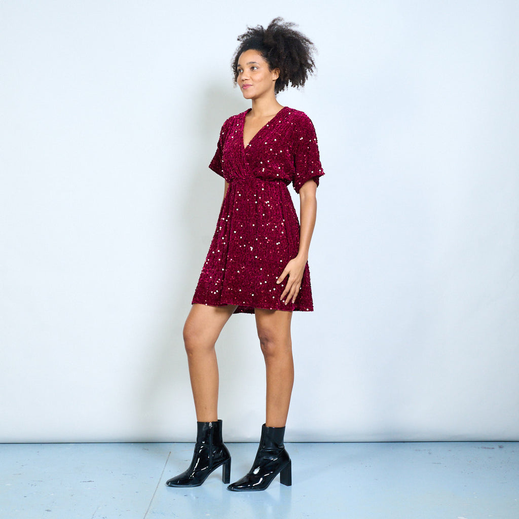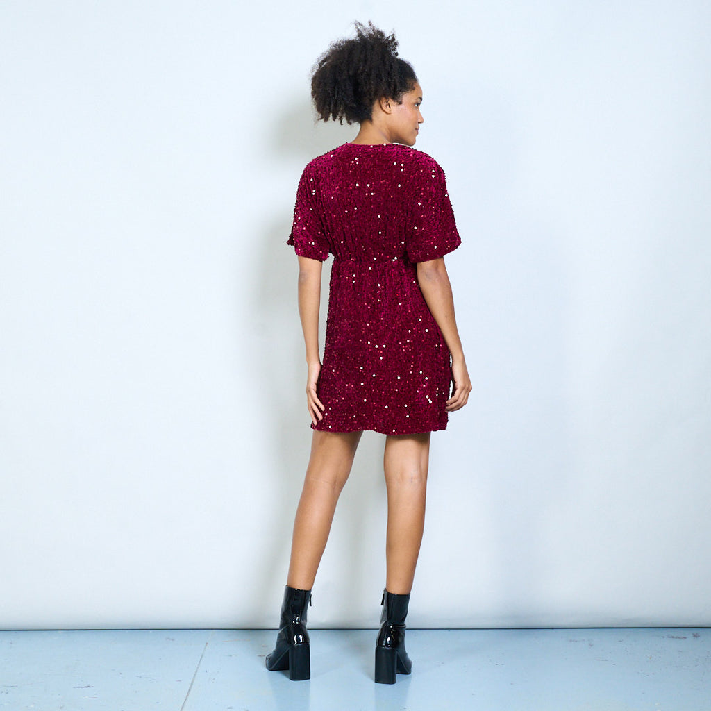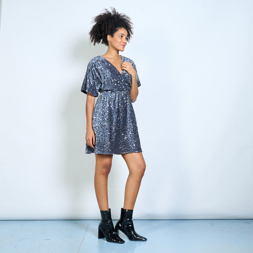 Мини-платье с v-образным вырезом и короткими рукавами, украшенное блестками, оптом