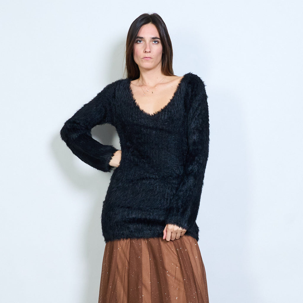 - Имеет глубокий V-образный линий, который создает элегантный силуэт