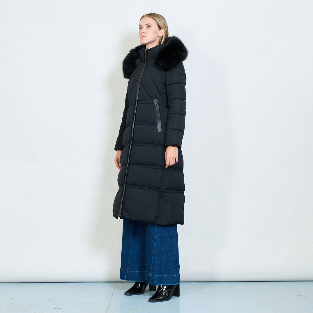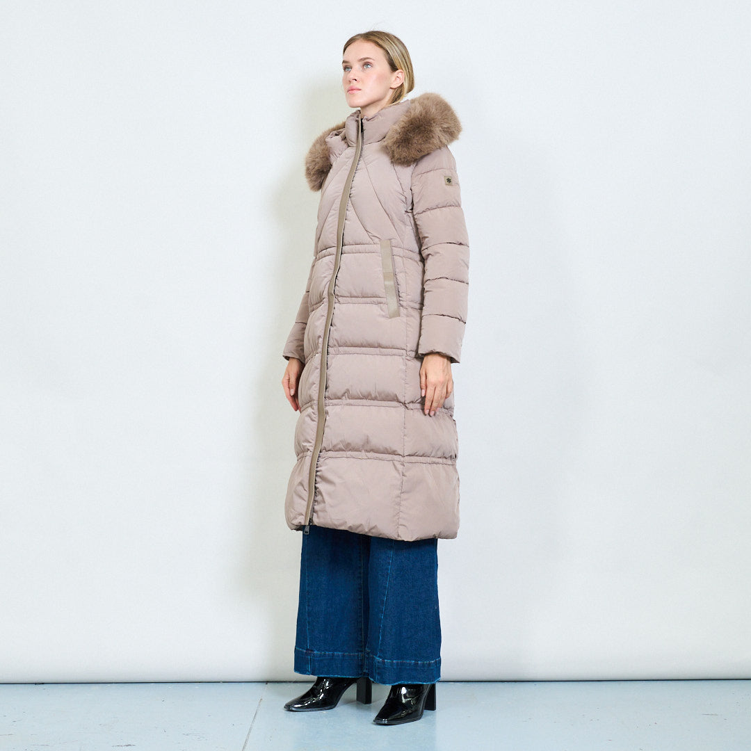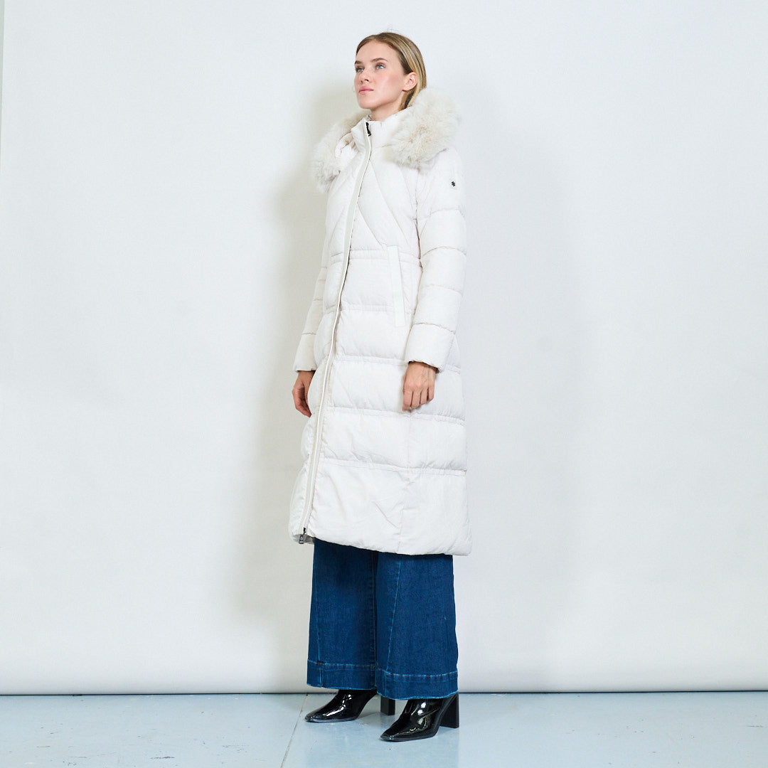 Длинное стеганое пальто с съемным вытяжным капюшоном из искусственного меха