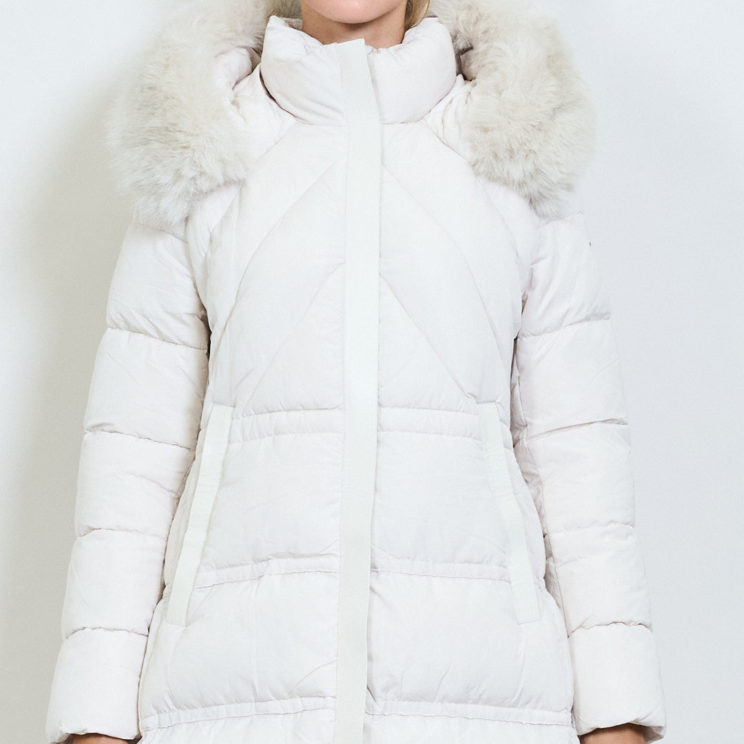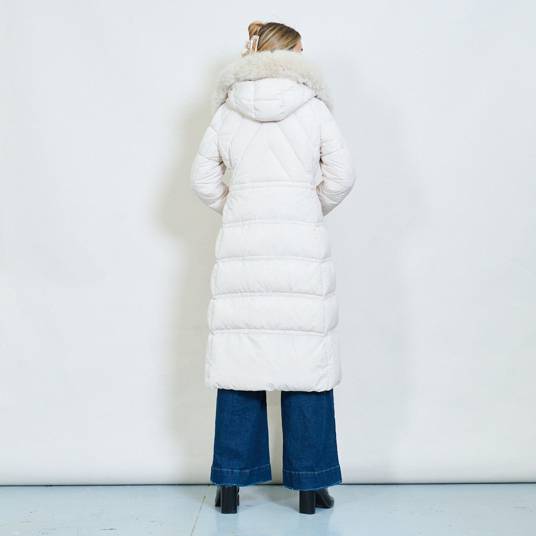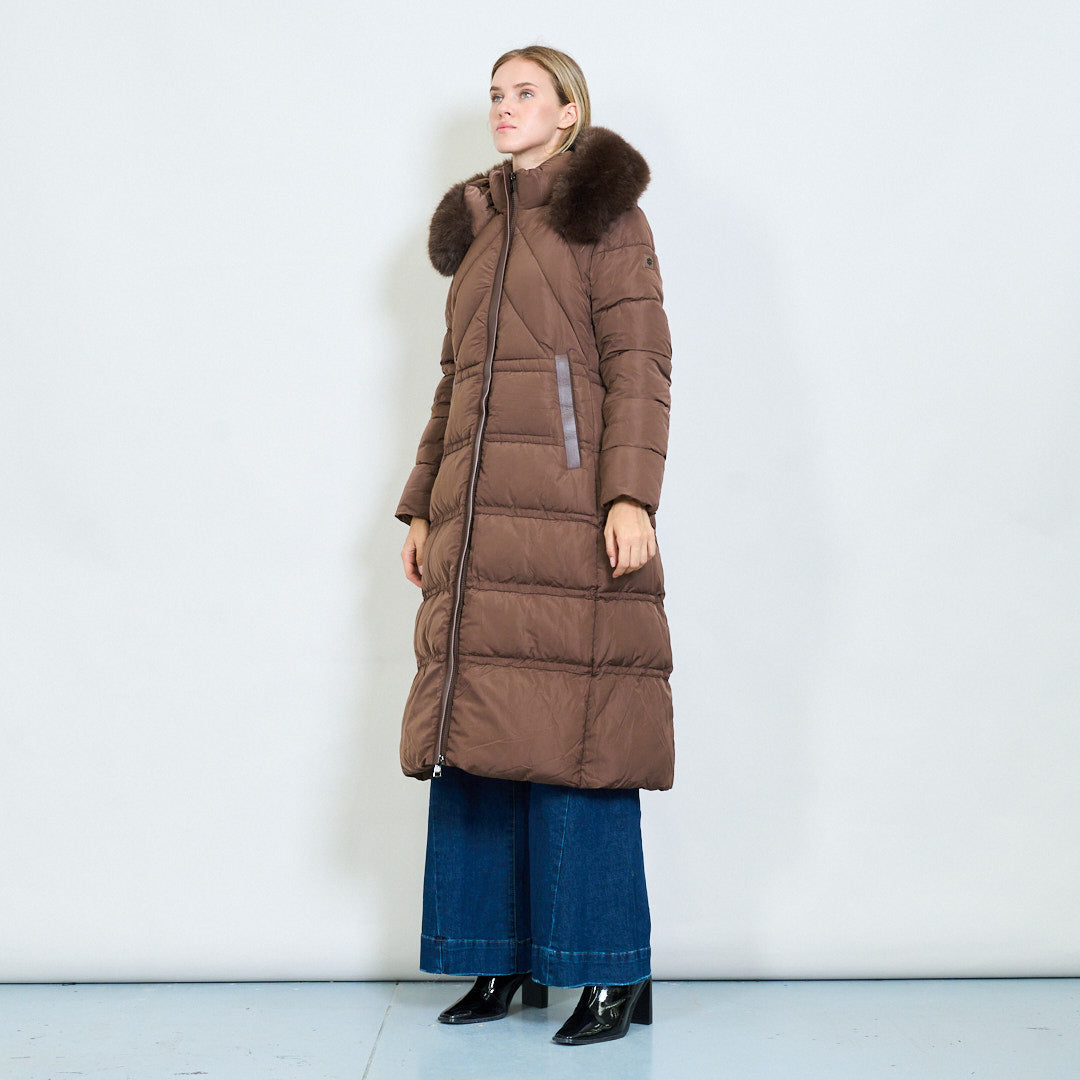 Длинное стеганое пальто с съемным вытяжным капюшоном из искусственного меха
