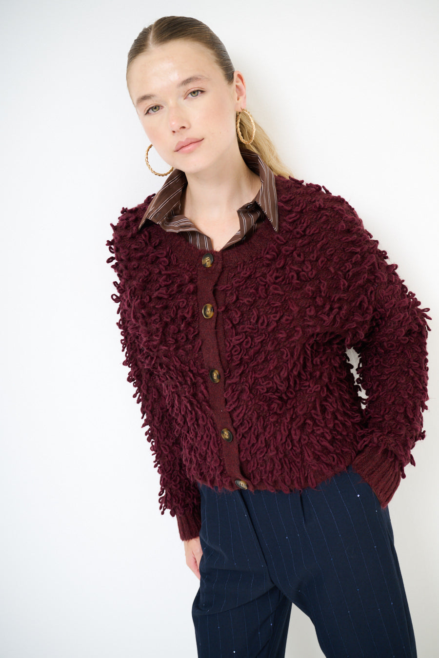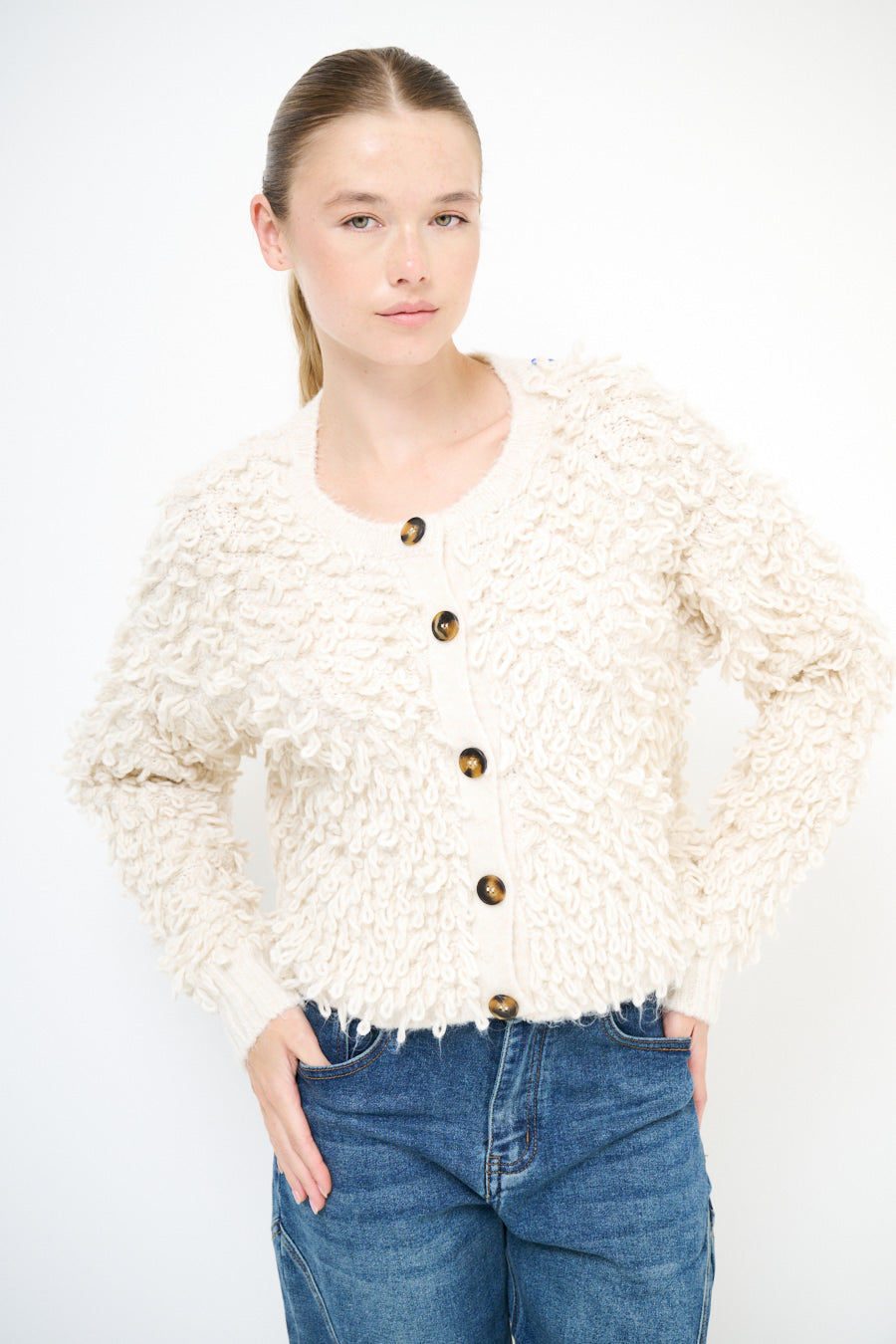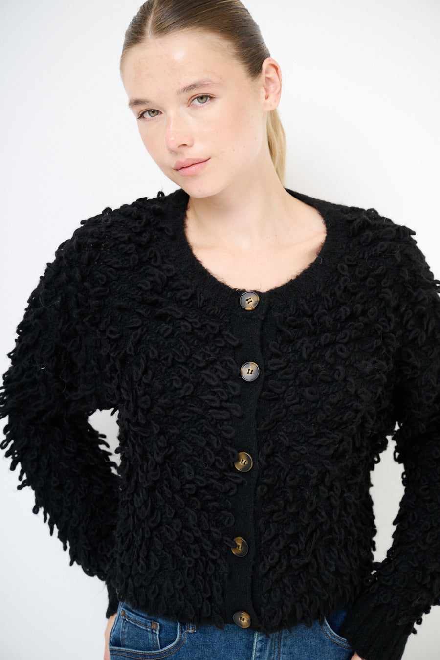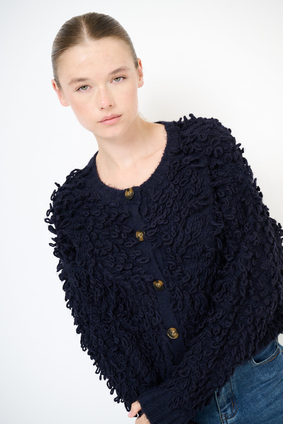 - Отличительная вязаная текстура петли на теле и рукавах