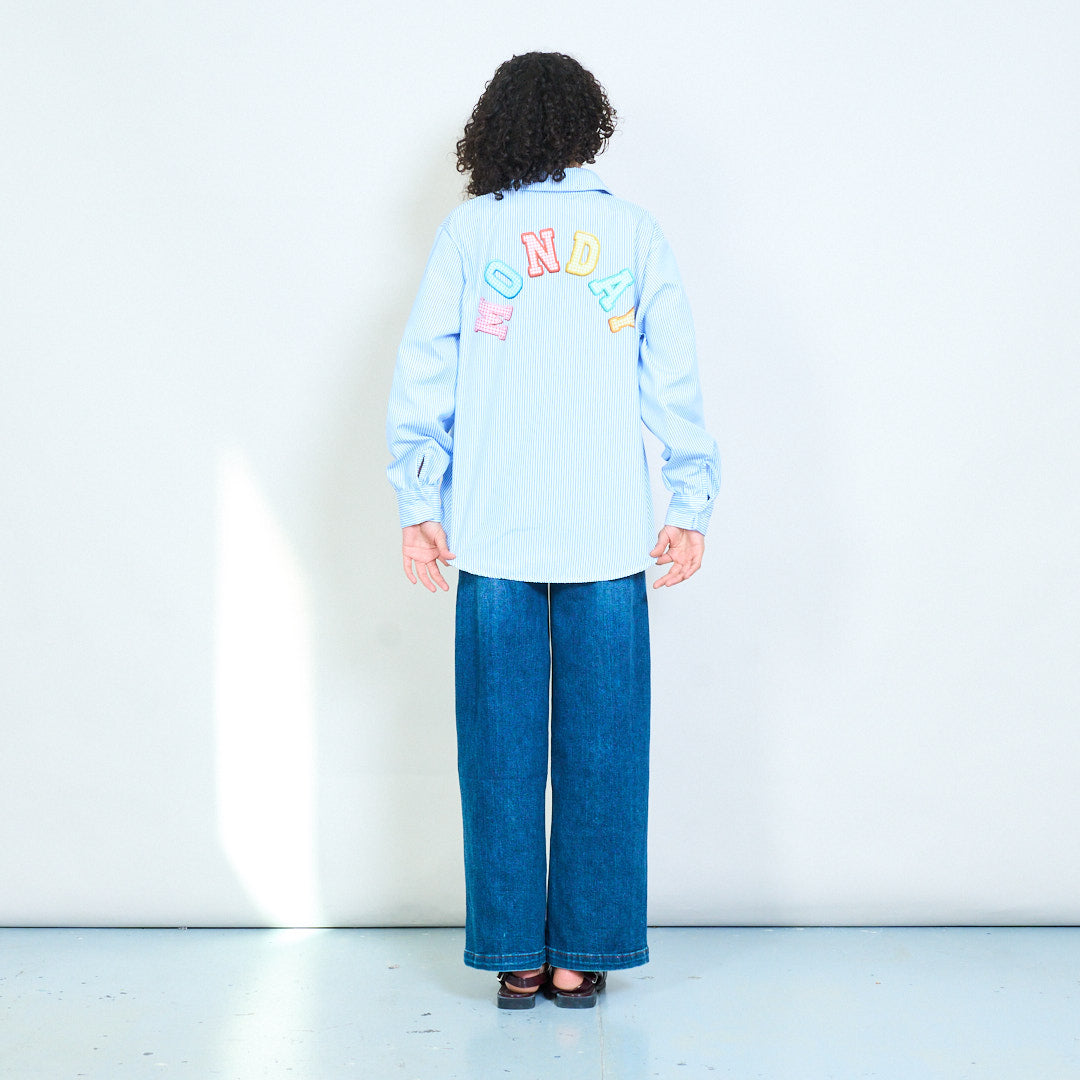 - Полосатая блузка с яркой вышитой надписью «Monday» на спине.
