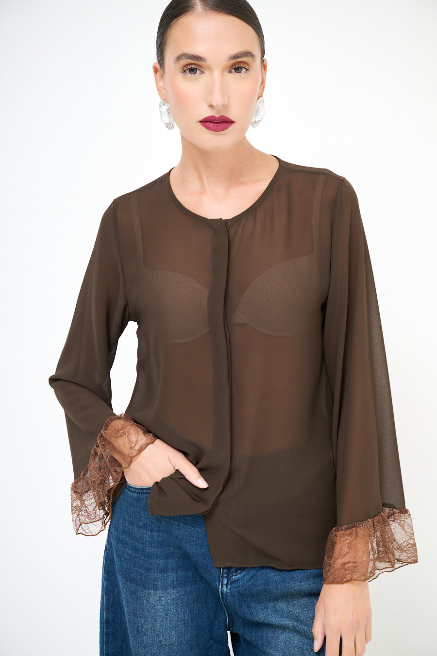 Прозрачная шифоновая блузка с кружевной манжетой деталь оптом