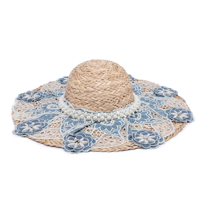 Вышитая кружевная и жемчужная соломенная шляпа с джинсовой цветочной аппликацией оптом