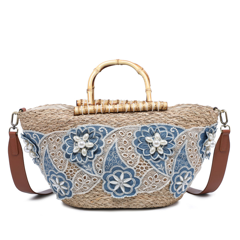 Овальная соломенная сумка с бамбуковыми ручками и джинсовой цветочной жемчужной вышивкой оптом