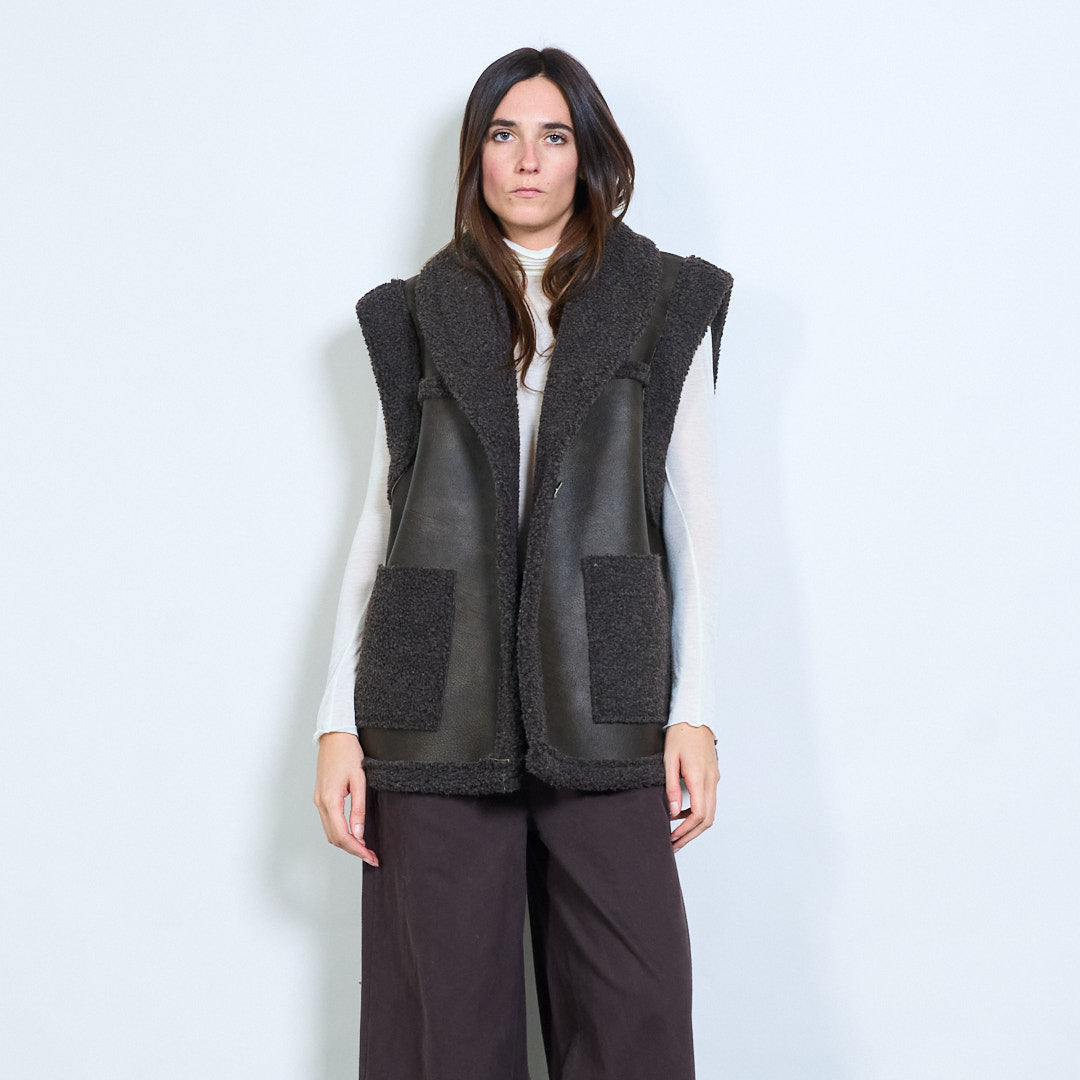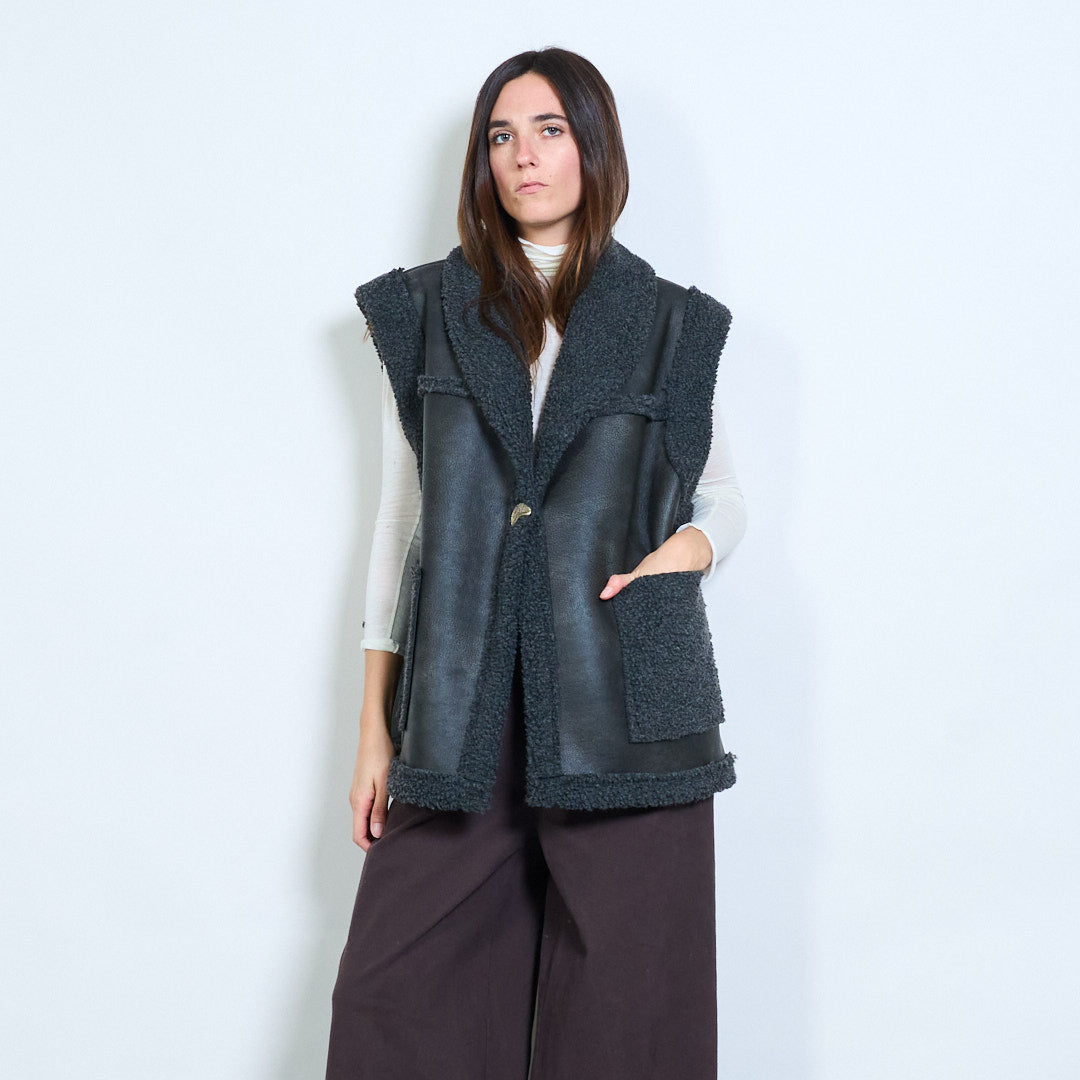 Жилет из искусственной кожи оверсайз с отделкой из овчины оптом