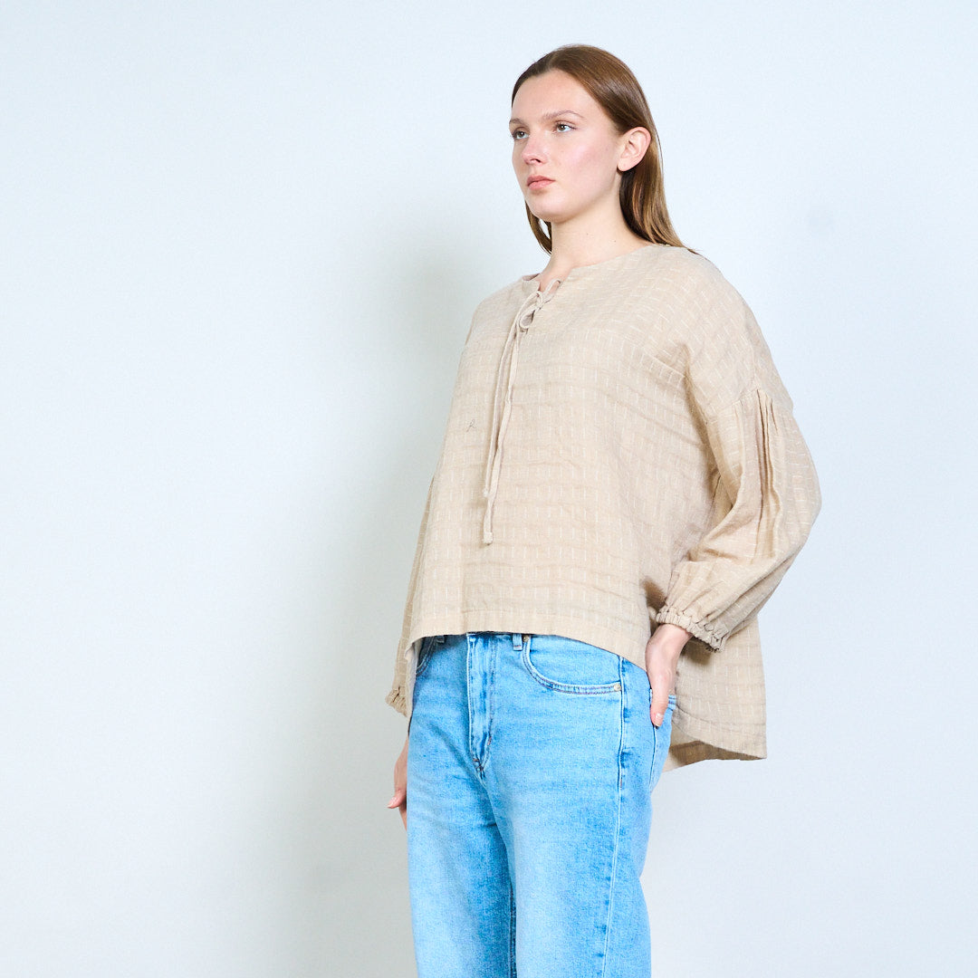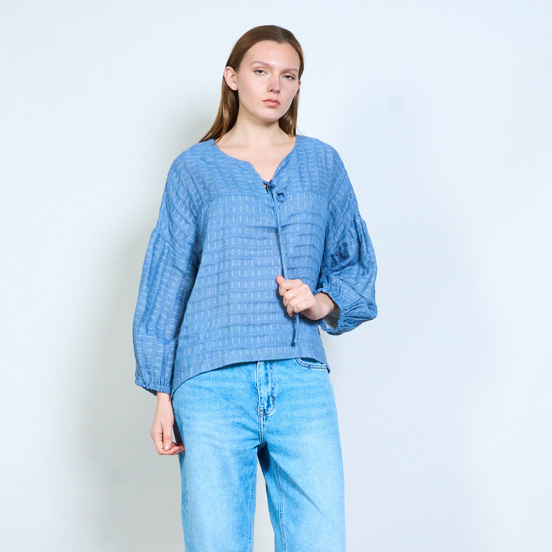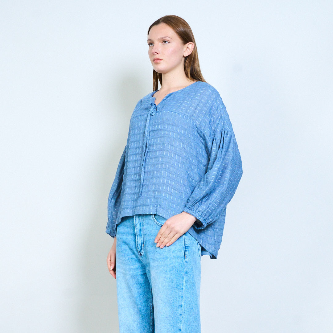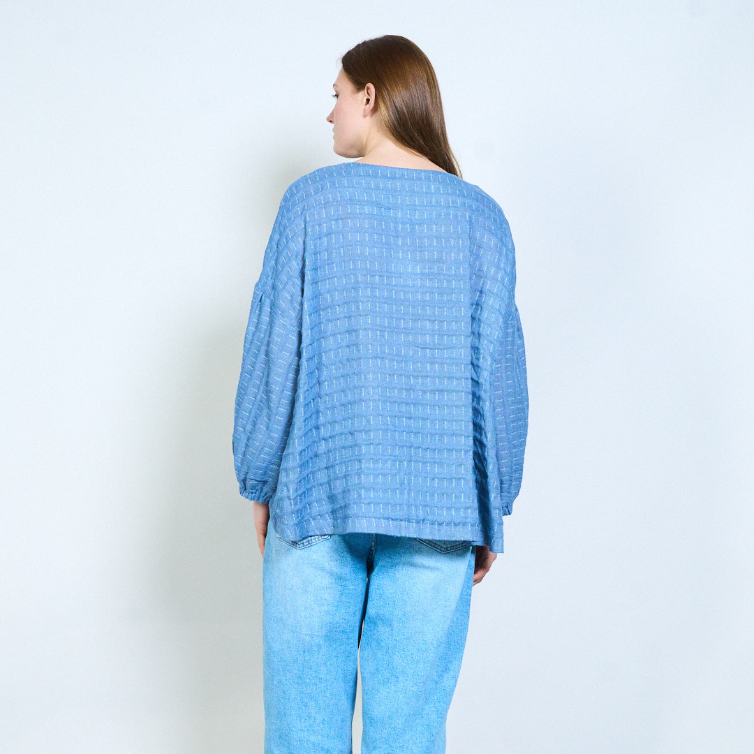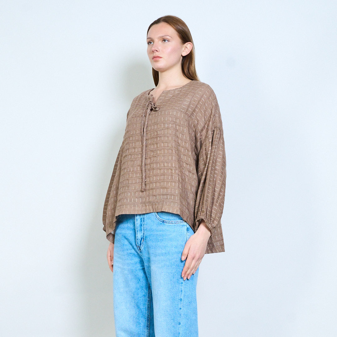 - Повседневный топ с узором в полоску по всей поверхности, создающим нежную визуальную текстуру.
