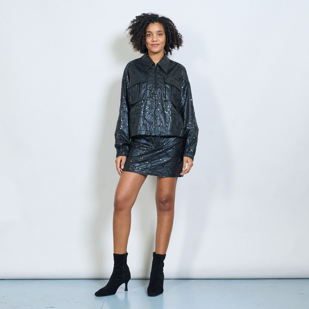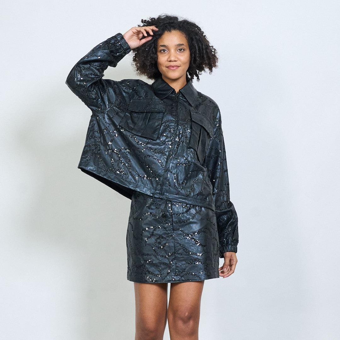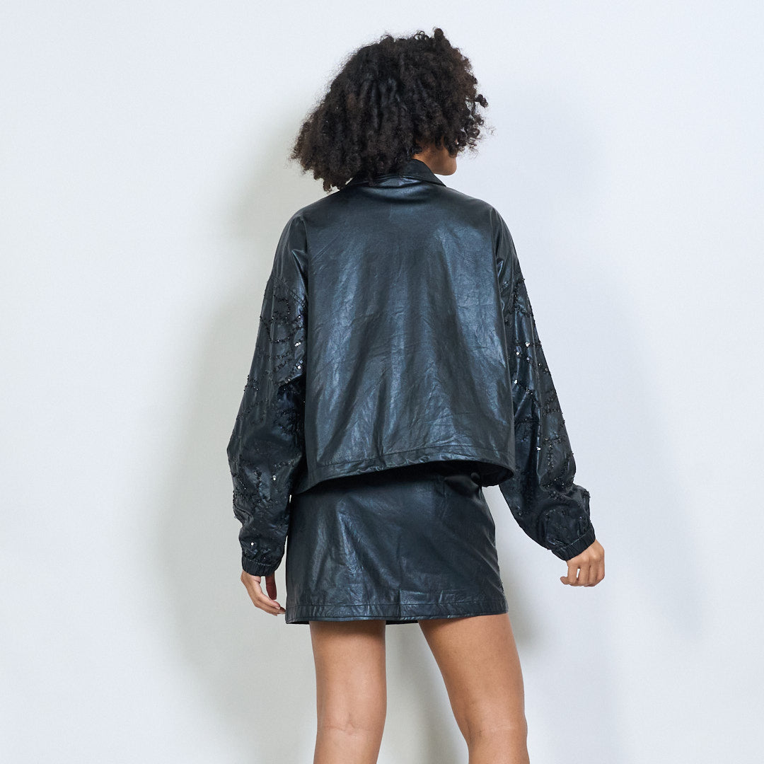 Обрезанная из искусственная кожаная куртка с вышивкой с блестками оптом